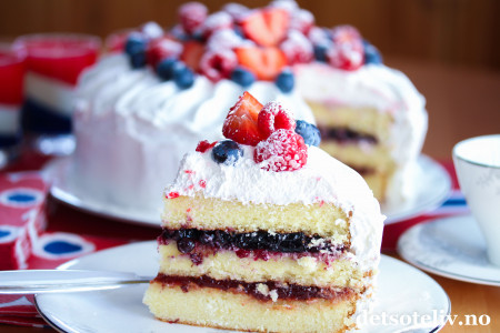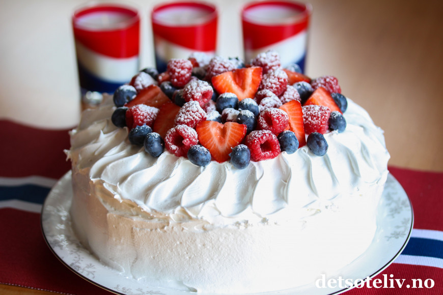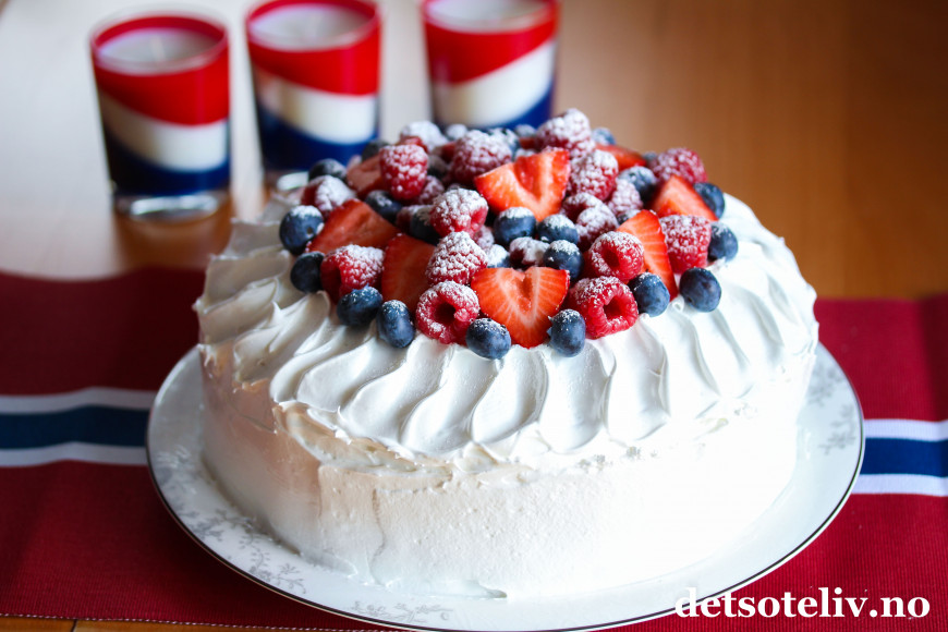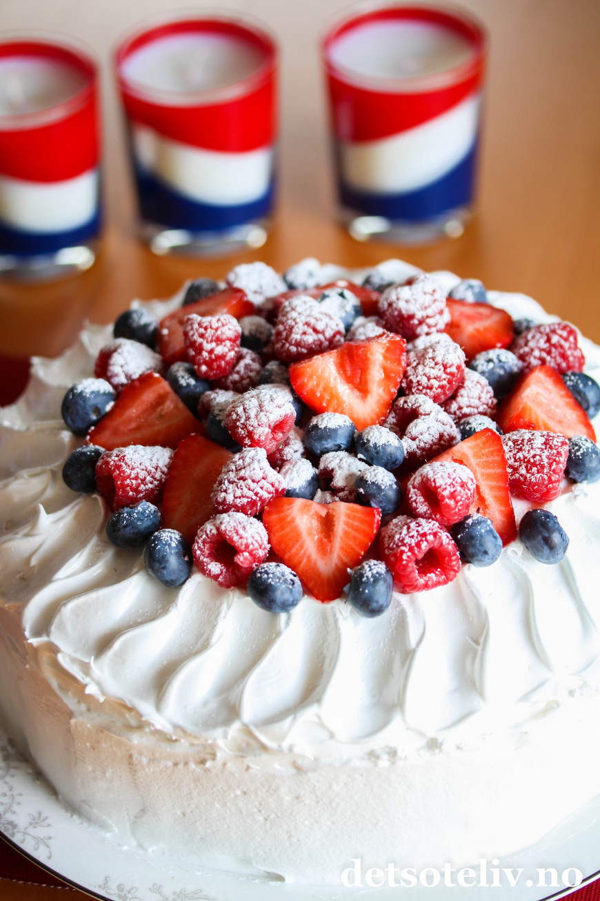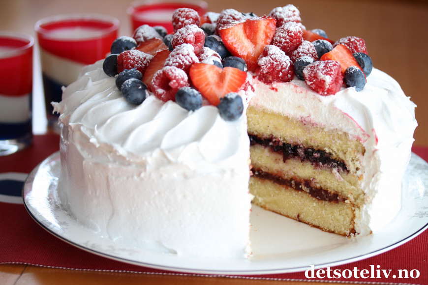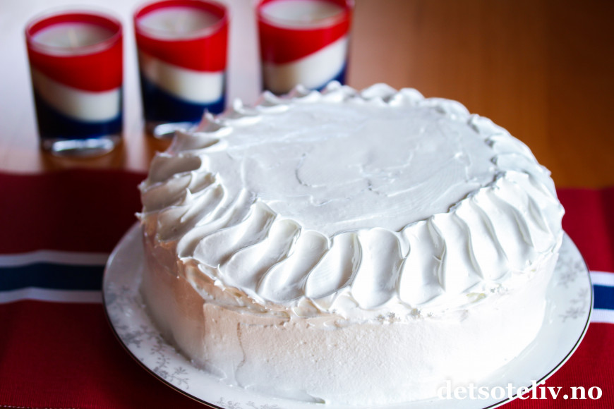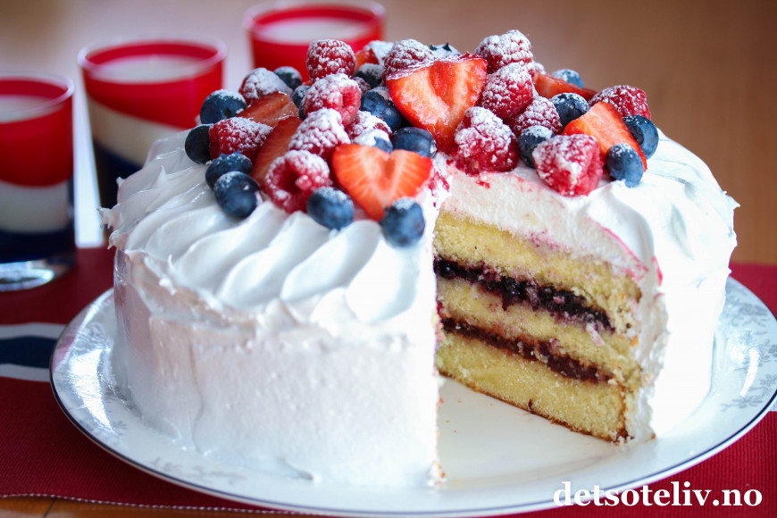 Jeg har dekket hele kaken med kritthvit marengskrem på typisk amerikansk vis. Med masse friske bær på toppen i rødt og blått, blir dette en vidunderlig 17. mai-kake!