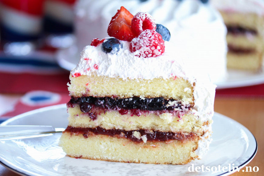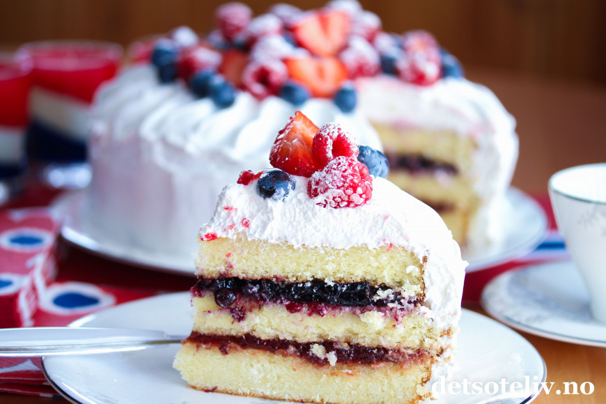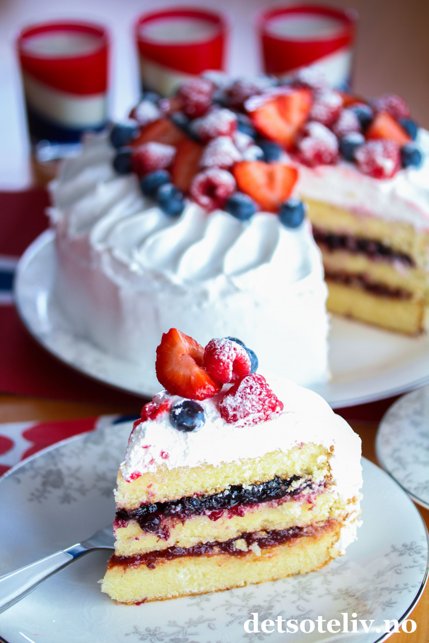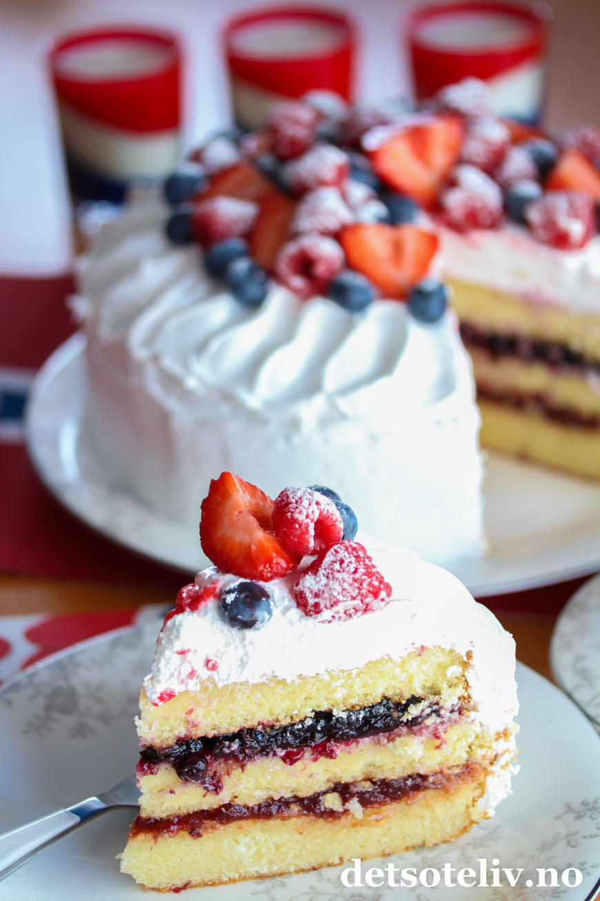 Kaken er basert på en amerikansk "White cake" som lages primært med eggehviter. Det gjør at kakebunnene får veldig lys farge, noe som jo passer fint fargemessig når man skal lage en kake i hvitt, rødt og blått.