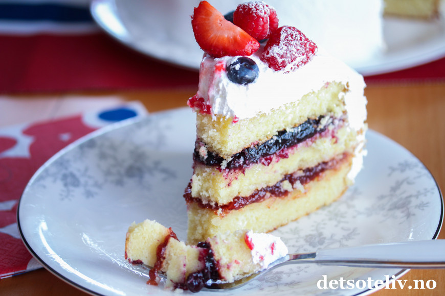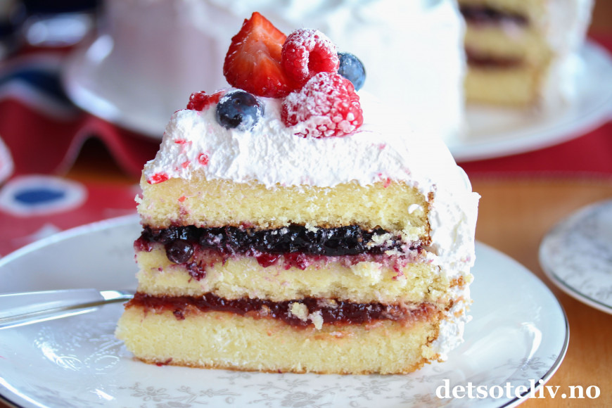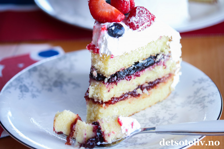 Jeg har fylt kaken med kvalitetssyltetøy fra det amerikanske merket Stonewall Kichen, som nå fås kjøpt i Norge. Det blå syltetøyet heter Wild Blueberry Jam, som er laget med villblåbær og er nydelig på smak. Det røde syltetøyet er et fantastisk syltetøy med smak av jordbær og champagne!