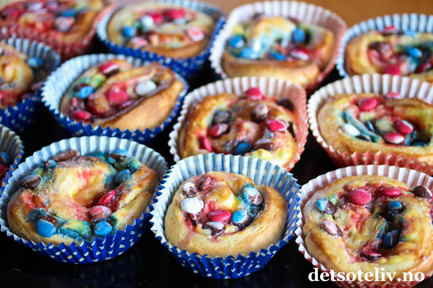 Som du ser på bildet vil nonstop smelte og farge av under stekingen, derfor blir snurrene finest å se på om de pyntes med melisglasur og flere nonstop.