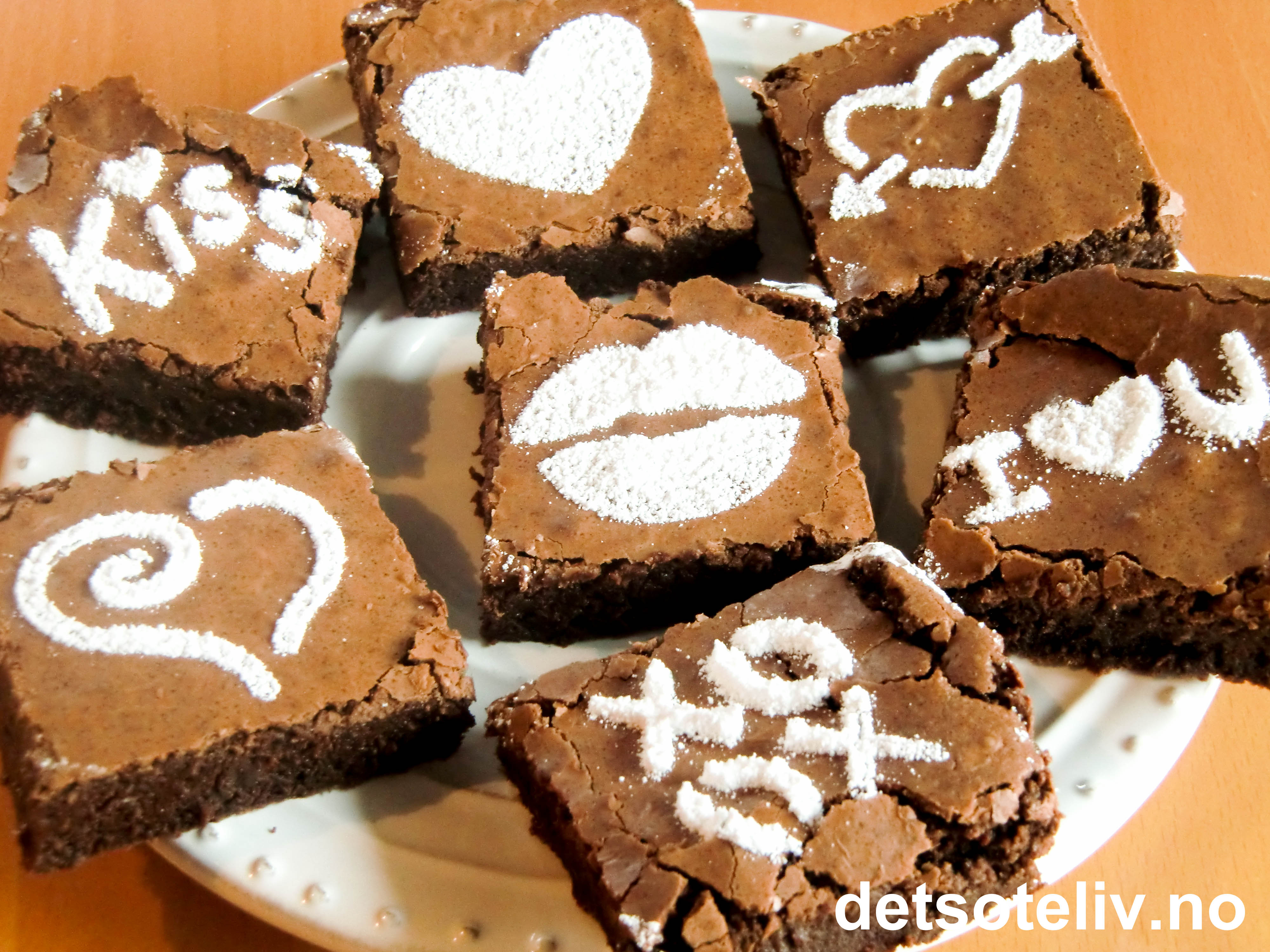 ♥ Den skjønne pynten på browniesene du ser på bildet lager du enkelt ved hjelp av stensiler med kjærlighetsmotiv.Fås blant annet kjøpt i merket Wilton i nettbutikken til Cacas, se www.cacas.no