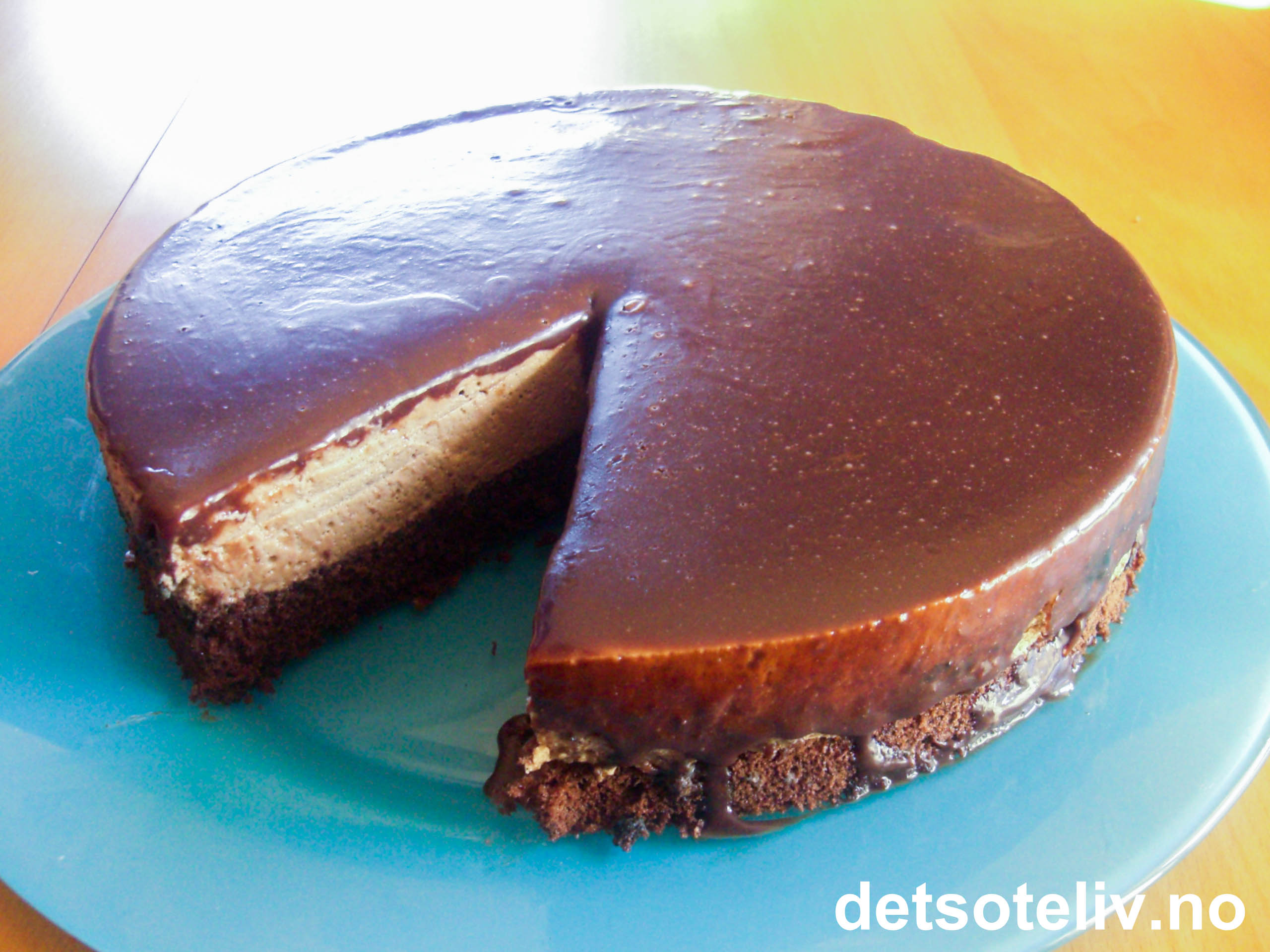 Ha deigen i en rund kakeform (24 cm i diameter) med bakepapir i bunnen. Stek kaken på rist midt i ovnen ved 180°C i 15-20 min (sjekk med kakenål at kaken er gjennomstekt). Avkjøl kaken helt i formen. Ta kaken ut av formen og fjern bakepapiret. Sett kaken på et passende kakefat og fest kakeringen rundt kaken.