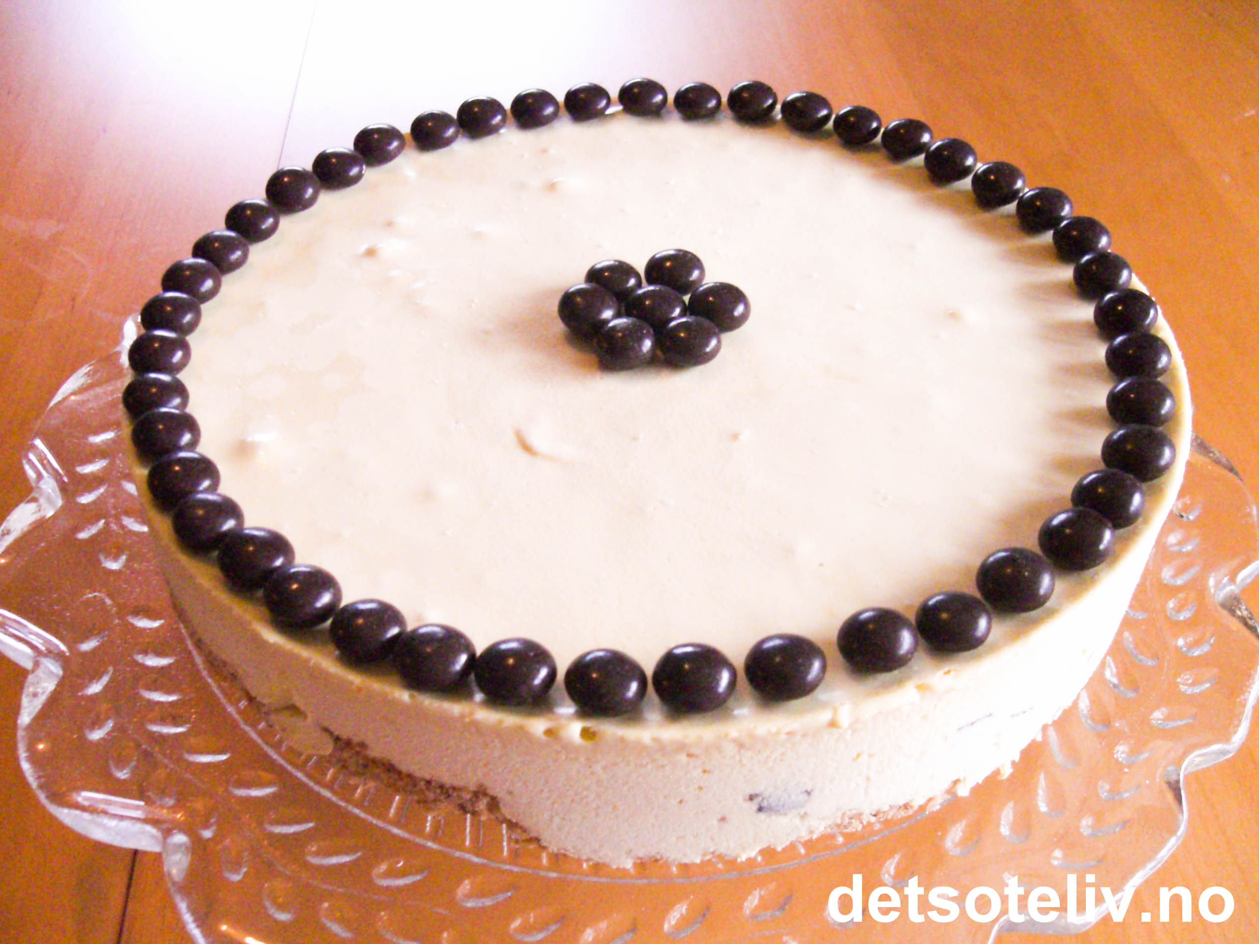 Hell isblandingen over i kakeformen. Sett i fryseren til isen har stivnet. Pynt med hakket After Eight eller After Eight pastiller, slik som på bildet.