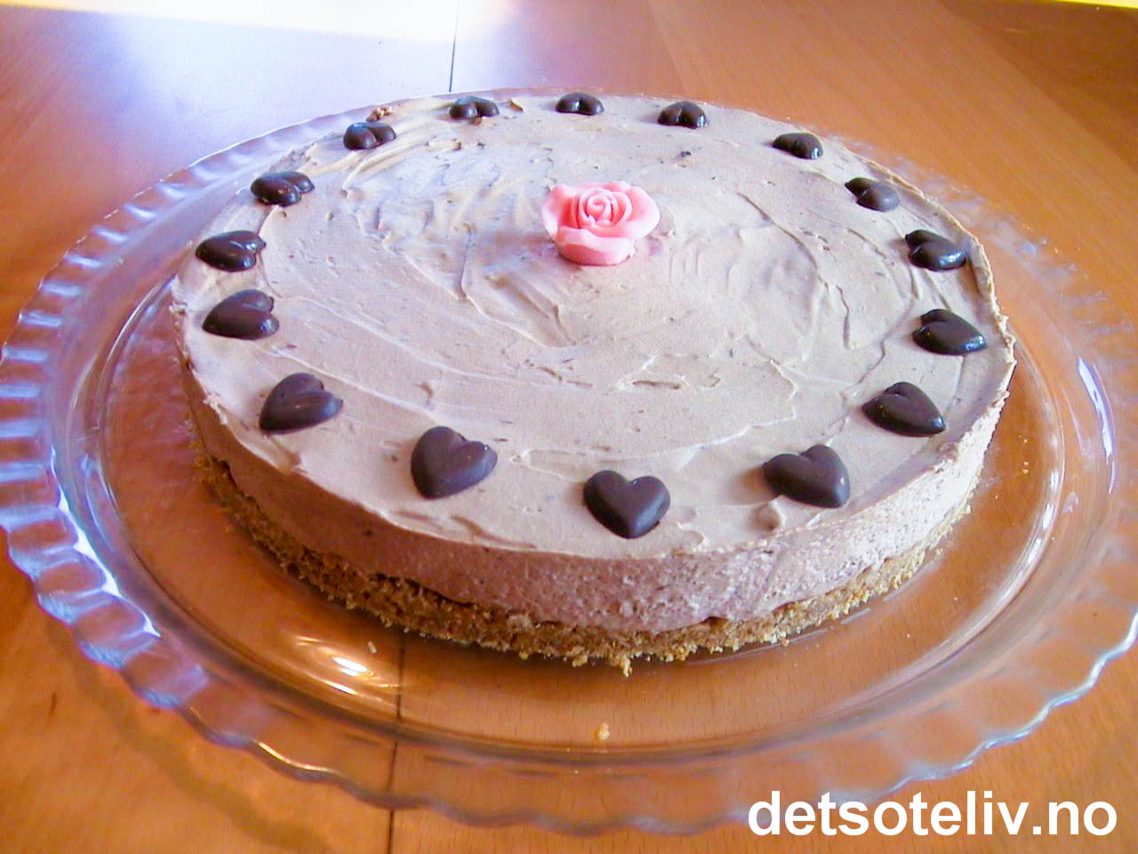 Skjær forsiktig langs kanten på formen og fjern kakeringen. Pynt kaken etter ønske, for eksempel med mørke sjokoladehjerter og en rosa marsipanrose i midten.