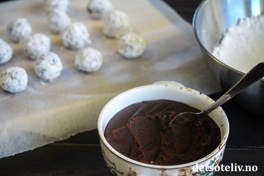 ♥ Bruk en teskje til å ta ut passe mengde trøffelmasse. Jeg synes det er enklest å rulle trøflene til kuler med hendene, men det blir klissete, så skyll hendene ofte i vann.