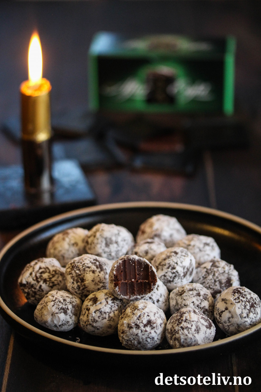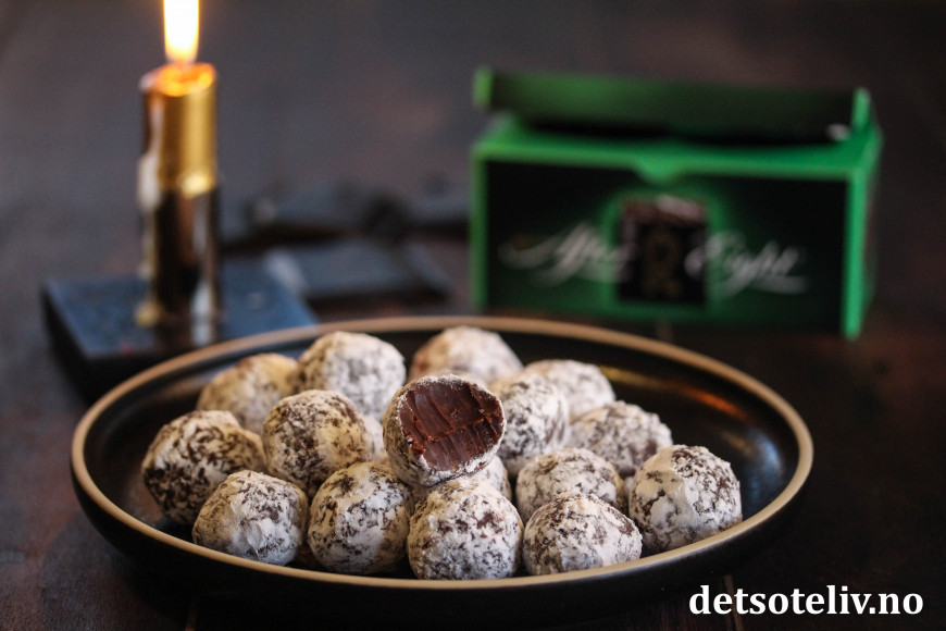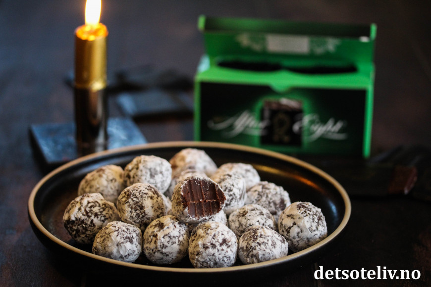 ♥ Dersom du ønsker sterkere mintsmak på trøflene, kan du øke mengden After Eight til 30 stk.
