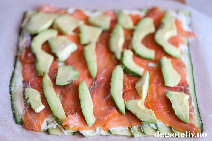 Legg på skiver av røkelaks. Legg skiver av 1 avokado på laksen.