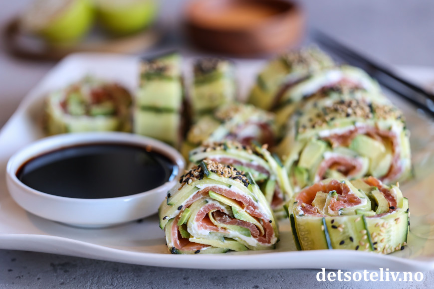 Dette er kjempegode agurkruller, som fylles med kremost, røkelaks og avokado. Her brukes det altså hverken sushiris eller noriark, for de som skulle være skeptiske til det, men nokså alminnelige, norske ingredienser. 😊 Bitene drysses med sesamfrø og dyppes i soyasaus og chilimajones, og spises gjerne med pinner som om det skulle vært sushibiter.