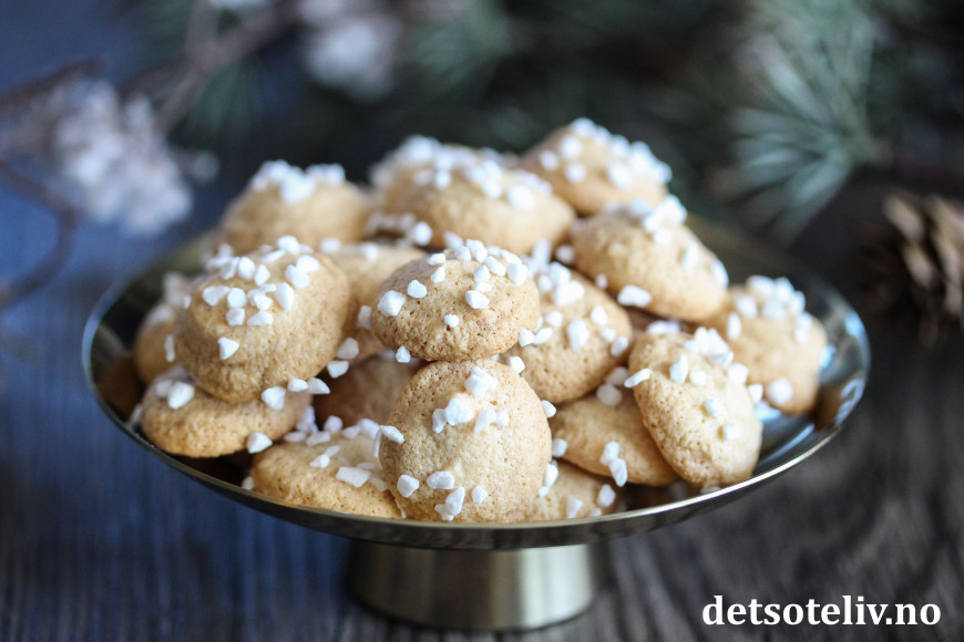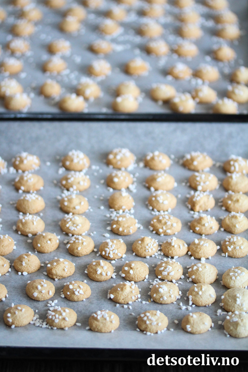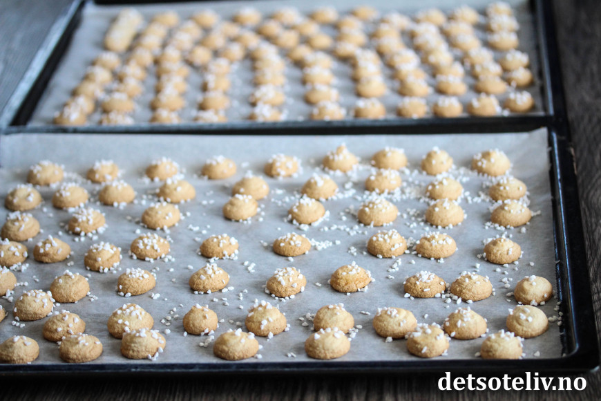Stek kakene midt i ovnen ved 150 °C i ca. 30 minutter. La kakene avkjøles helt før de has i kakeboksen slik at de beholder sprøheten.