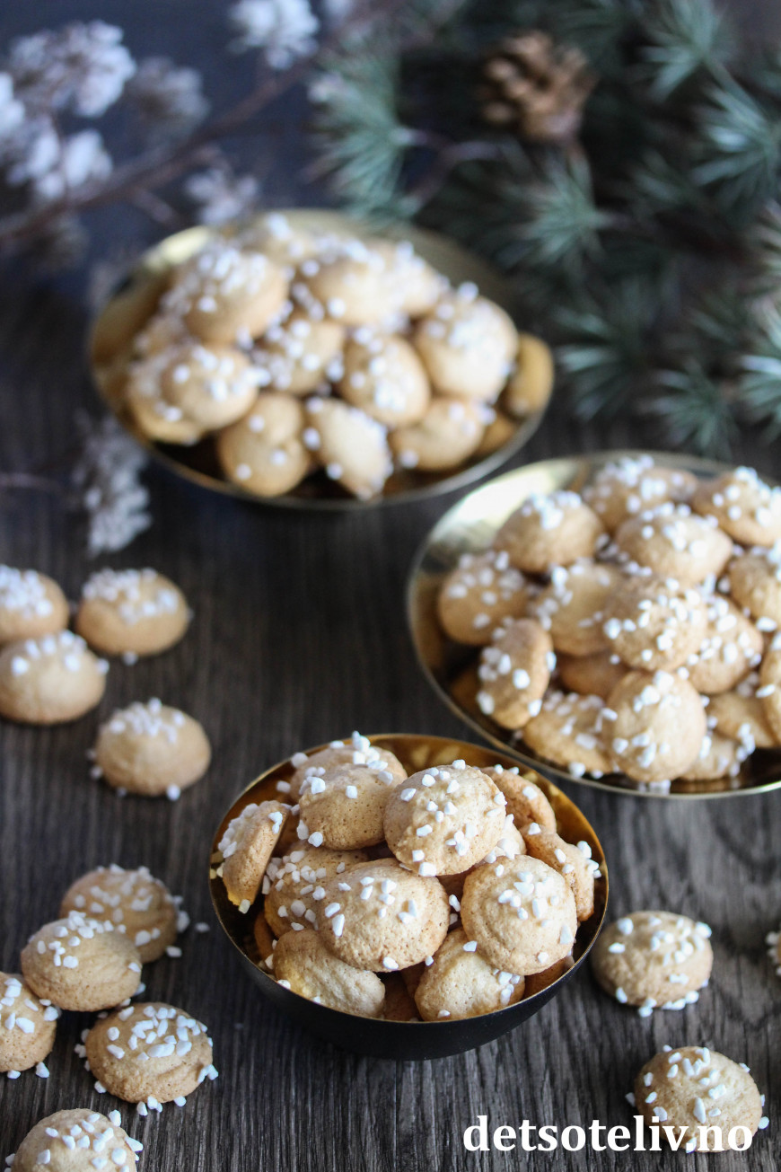 ♥ For å få den rette mandelsmaken på kakene, kreves det egentlig 3–4 stk bittermandler, men disse er ikke så lette å få tak i her i Norge. Det hjelper da å tilsette mandelessens i tillegg til mandellikøren. Jeg liker å bruke nokså mange dråper mandelessens, men dette er en smakssak.