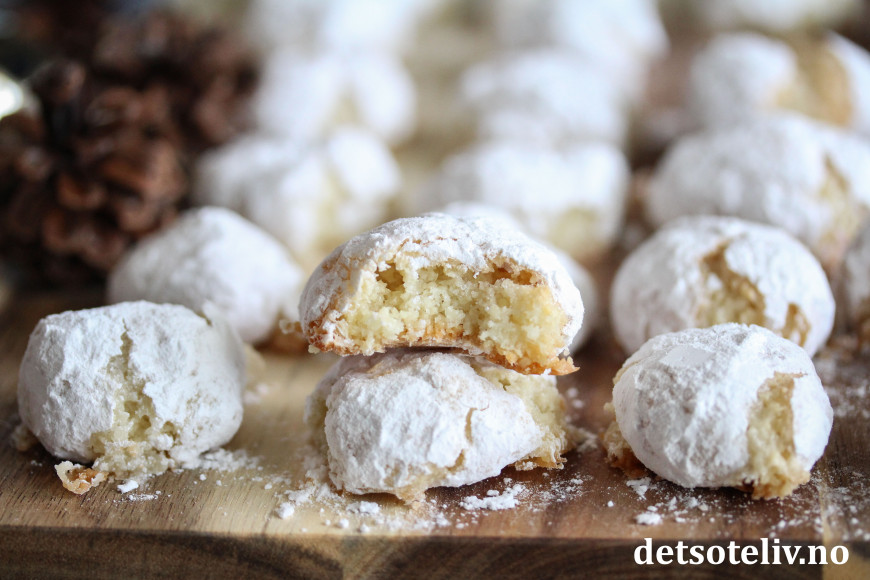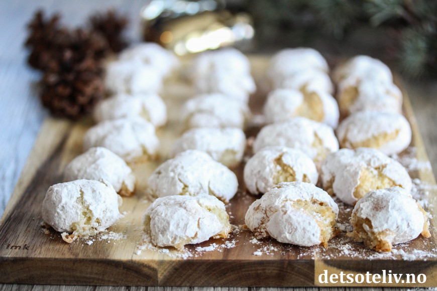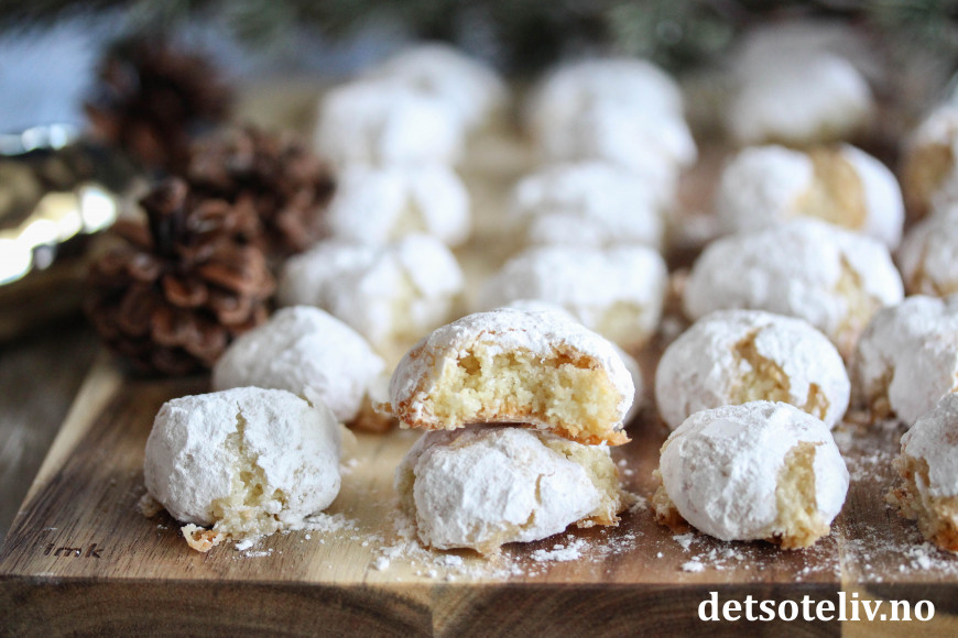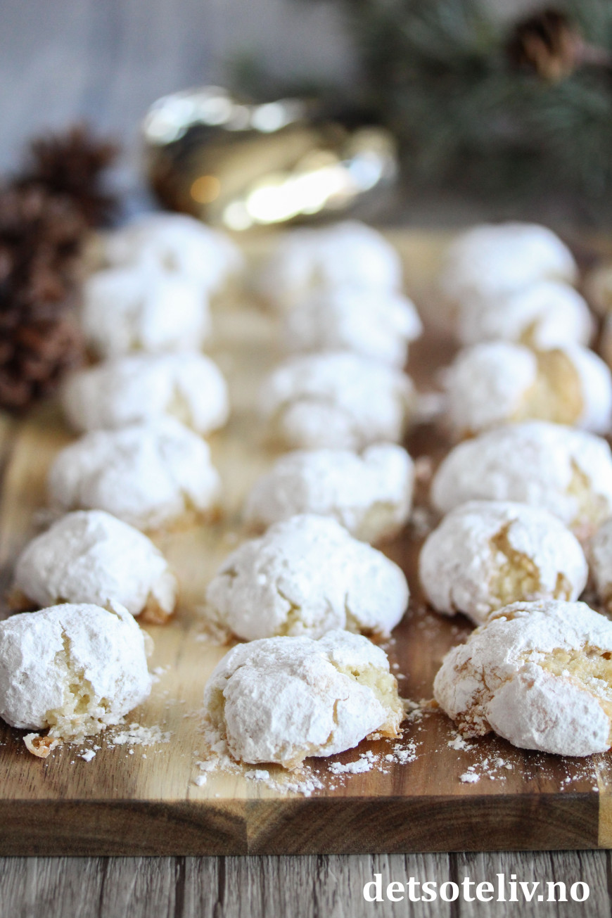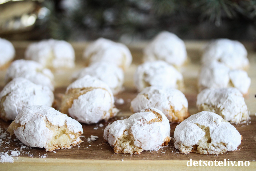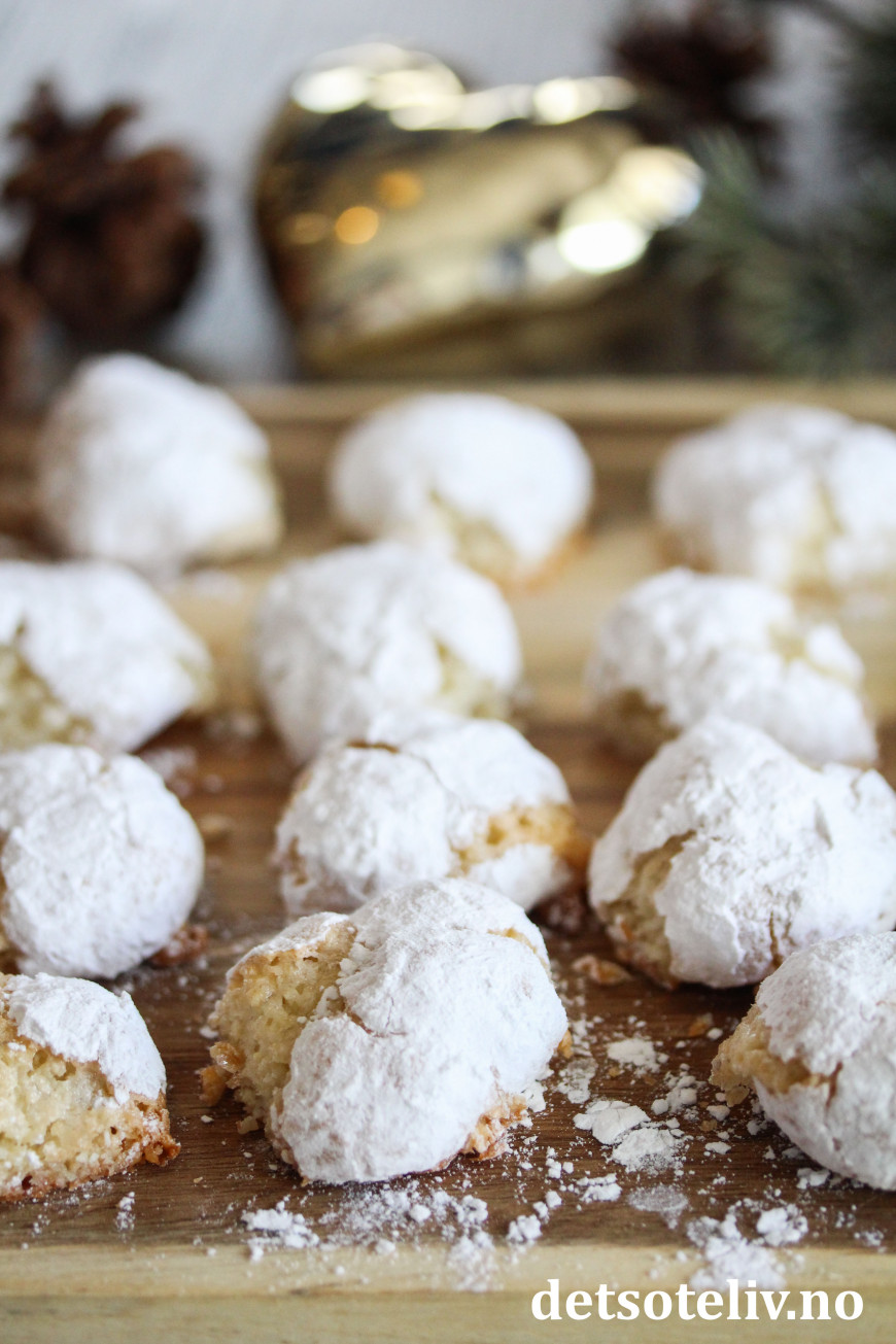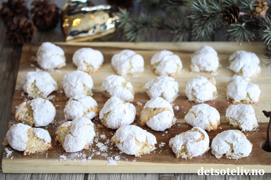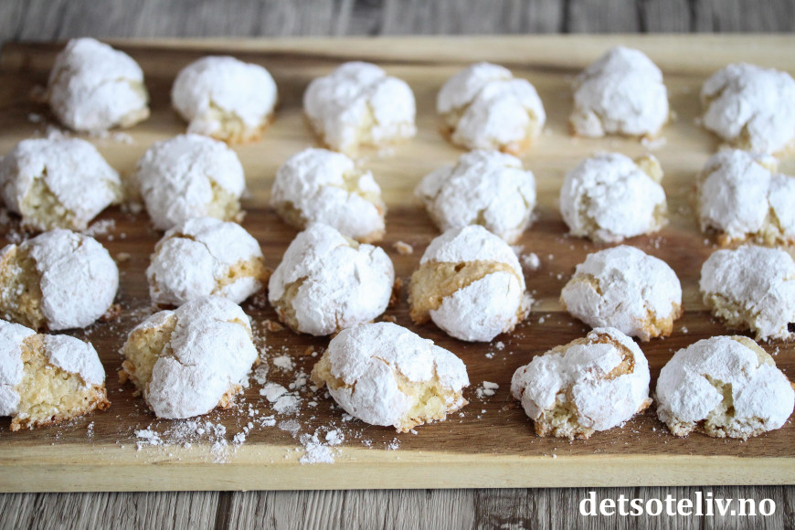 Sett kulene på bakepapirdekkede stekeplater og stek dem midt i ovnen ved 150 °C i ca. 25 minutter. Det er helt normalt at kakene sprekker opp under stekingen.