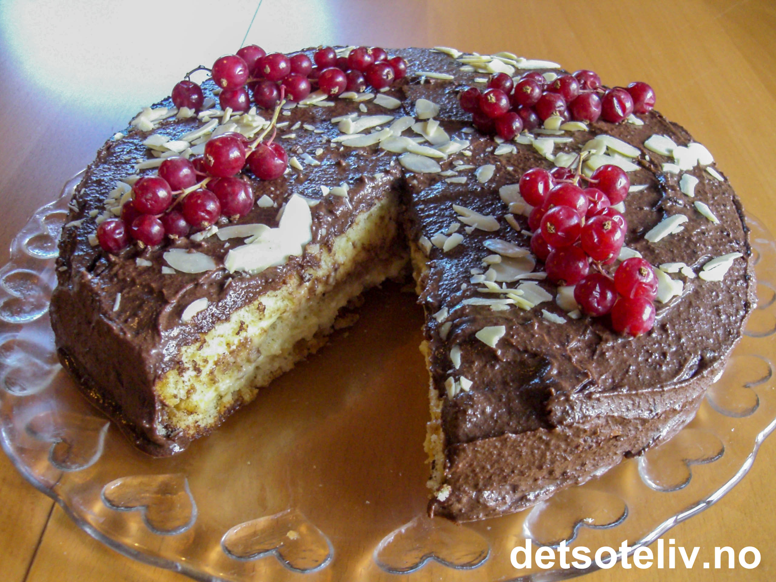 Dynk bunnene med en blanding av vann og Amarettolikør. Ha vaniljekrem mellom kakebunnene. Dekk kaken med sjokoladeglasuren. Dryss over mandelflarn og pynt kaken eventuelt med rips.