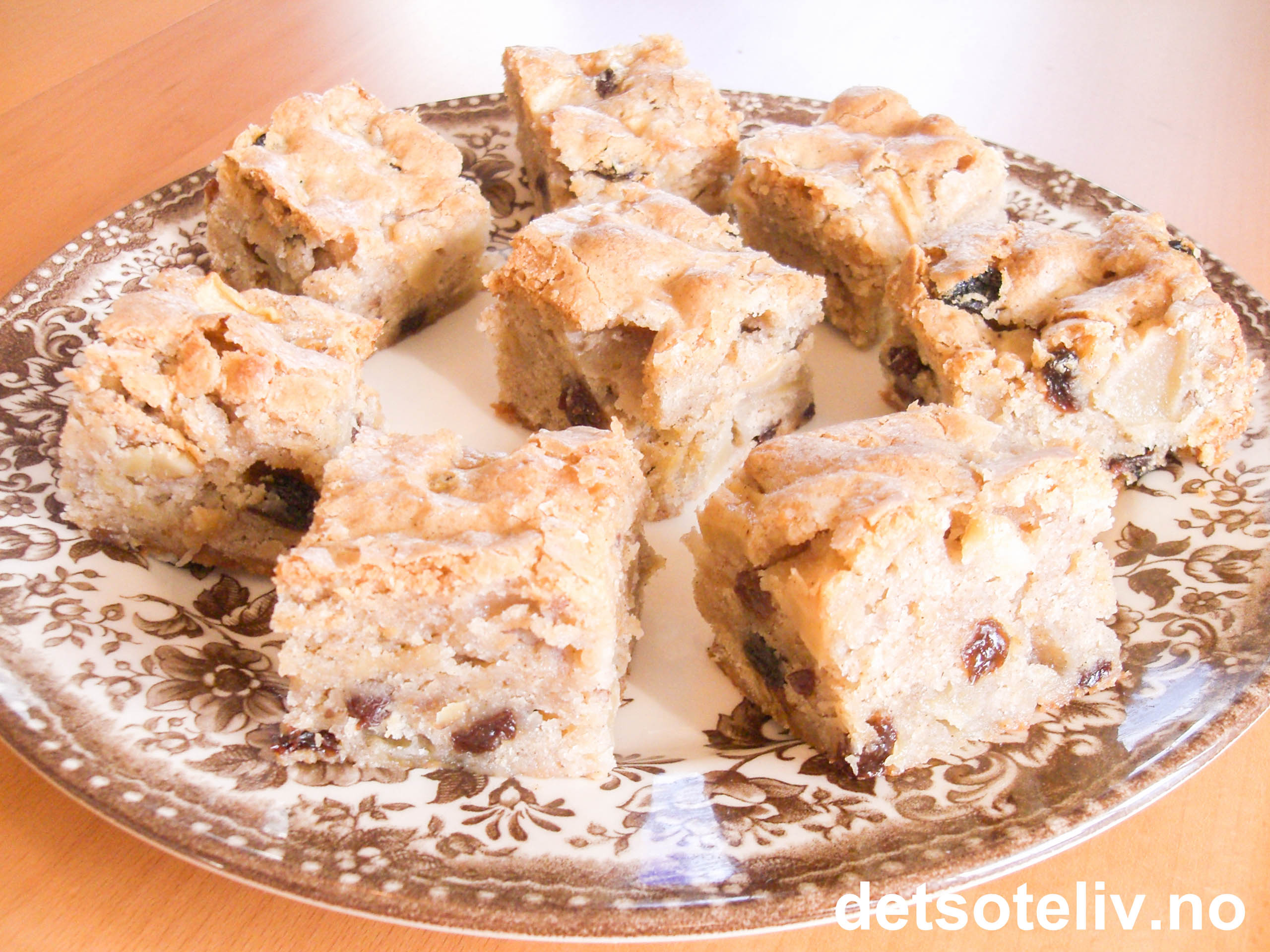 Pisk sammen egg, melk og majones med en stålvips. Rør i sukker, bakepulver og krydder. Bland så i hvetemelet og rør til du får en jevn deig. Vend i rosiner, hakkede valnøtter og eplebiter. Det blir en temmelig tykk og kompakt deig.