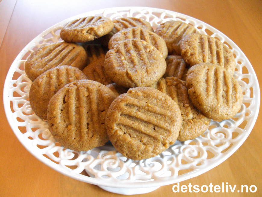 Form deigen til runde kuler som legges på bakepapirdekket stekeplate og trykkes flate med en gaffel.