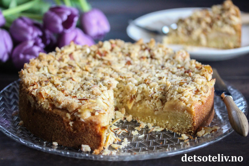 Her har du en amerikansk oppskrift på eplekake som opprinnelig heter Apple Almond Toffee Cake. Kaken toppes med et karamellisert mandeldekke som smaker veldig godt!