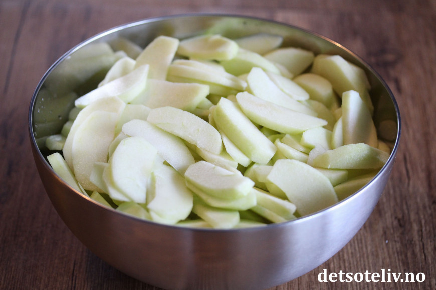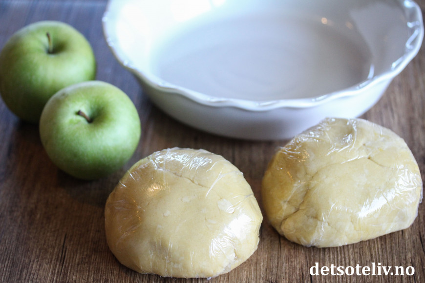 La bollen stå i romtemperatur i 1 time slik at eplene avgir noe av saften (dette forhindrer at eplefyllet inni paien blir for bløtt).
