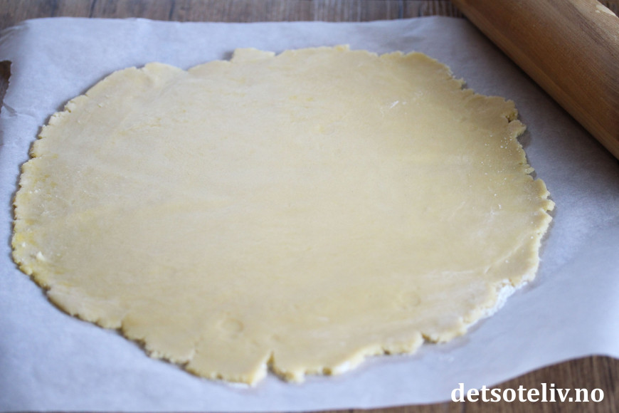 Bland mel, sukker og salt i en food processor. Tilsett mykt, romtemperert smør og kjør blandingen sammen slik at smøret smuldrer seg i det tørre. Tilsett eggeplomme og kaldt vann og kjør videre til deigen samler seg. Pakk deigen inn i plastfolie og sett den kjølig i 30 minutter.
