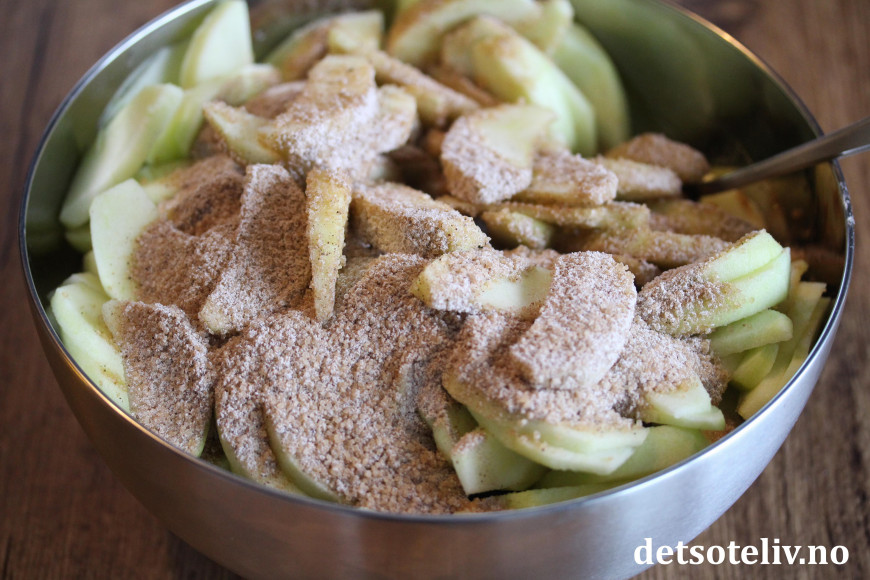 Bland sammen brunt sukker, kanel og maisenna og ha dette over eplene. Igjen bland godt slik at alle epleskivene blir dekket.