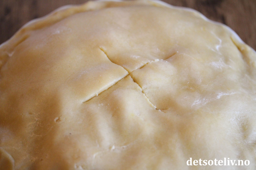 Finn frem en dyp, ildfast paiform som er ca 26 cm i diameter og 8 cm høy (vanlig springform på 26 cm i diameter kan også brukes) og spray den med formfett. Del mørdeigen i to deler. Kjevle ut den ene delen på et stykke bakepapir.
