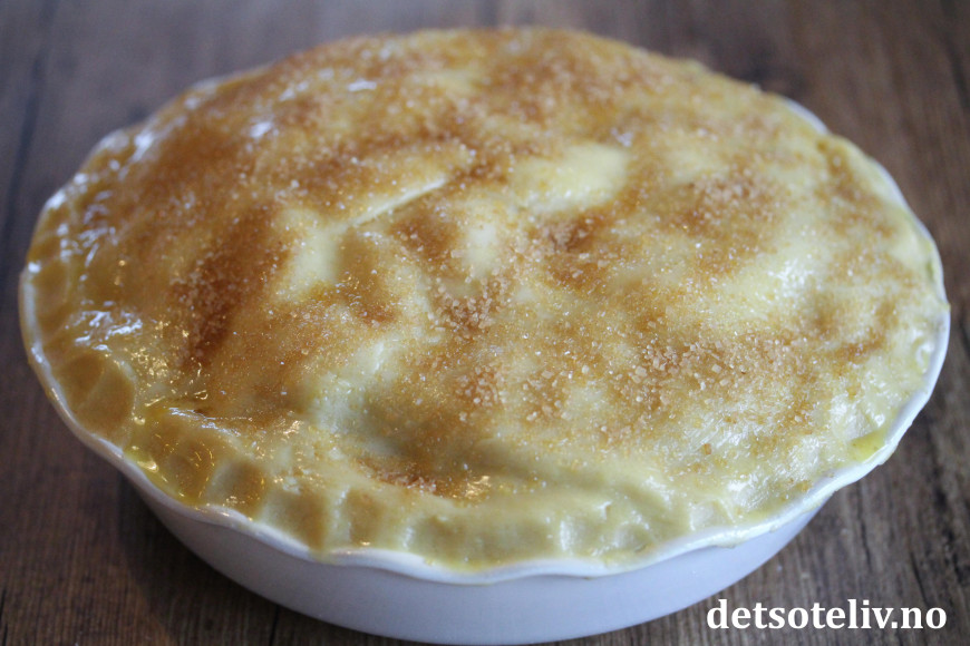 Kjevle ut den andre delen av deigen på et stykke bakepapir og legg over eplefyllet. Klem sammen deigen i kantene av formen. Snitt et kryss på midten av deigen med en skarp kniv. Pensle over med sammenvispet egg og dryss over brunt sukker. Sett formen i kjøleskapet i 30 minutter før steking.