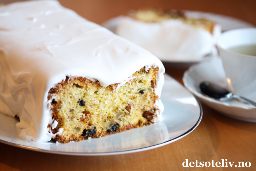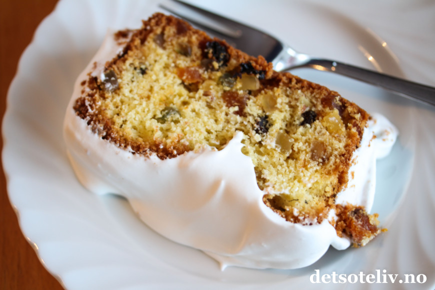 Fruktkaken bakes mye til jul og er usedvanlig saftig. Den inneholder både rosiner, sukat, apsikat og hakkede mandler. Kaken dekkes med en tykk, klissete, amerikansk marengsglasur – noe som gjør kaken spennende og smaken unik!