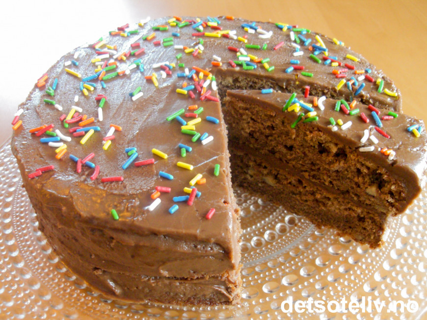 Fordel sjokoladekremen mellom kakebunnene og rundt hele kaken. Pynt med kakestrøssel eller annen kakepynt.