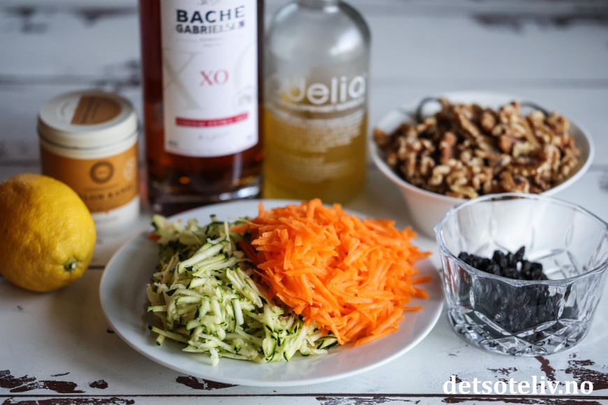 Pisk egg og sukker til eggedosis. Rør i olje, sitronskall, natron, kanel og bakepulver. Bland i hvetemelet og rør til en klumpfri deig (bruk en stålvisp). Rør deretter i rosinene og konjakken. Ha til slutt i revet gulrot og/eller squash (se tips) og hakkede valnøtter og bland deigen sammen.