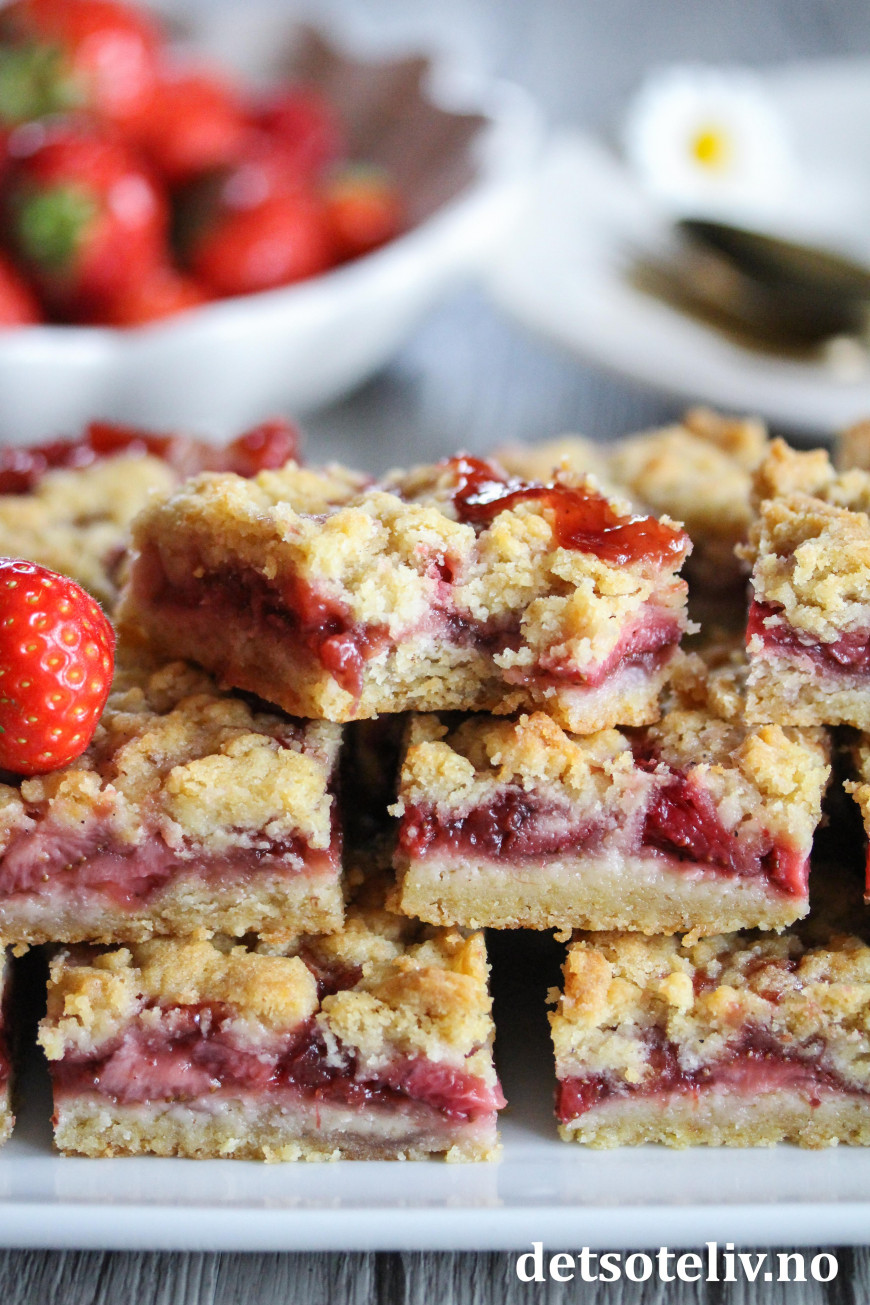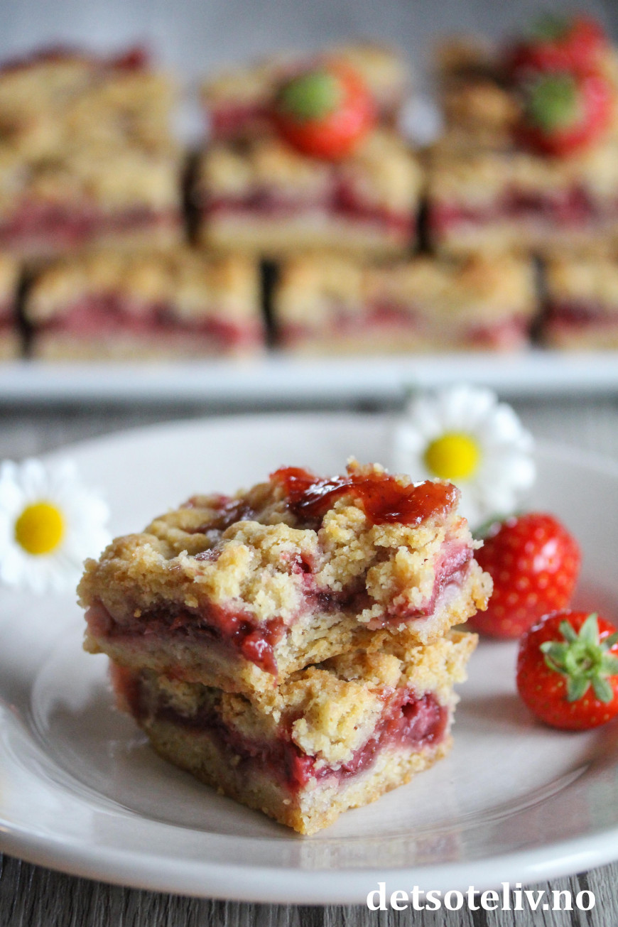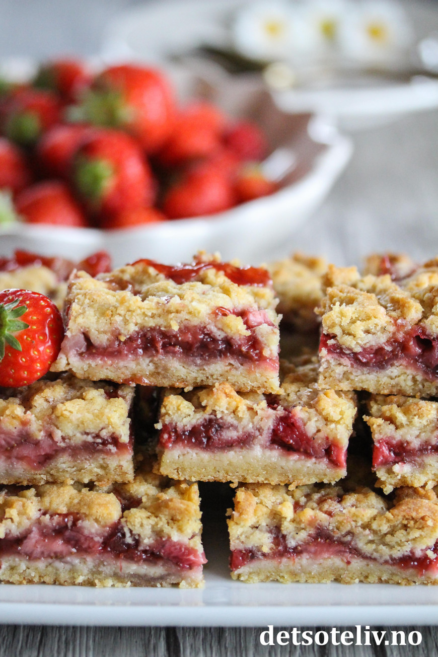 Dette er en jordbærvariant av amerikanske «Blueberry Bars». Kakene lages med mørdeig i bunnen, og det er også mørdeig som smuldres på toppen. I midten er det en kombinasjon av friske jordbær og jordbærsyltetøy.