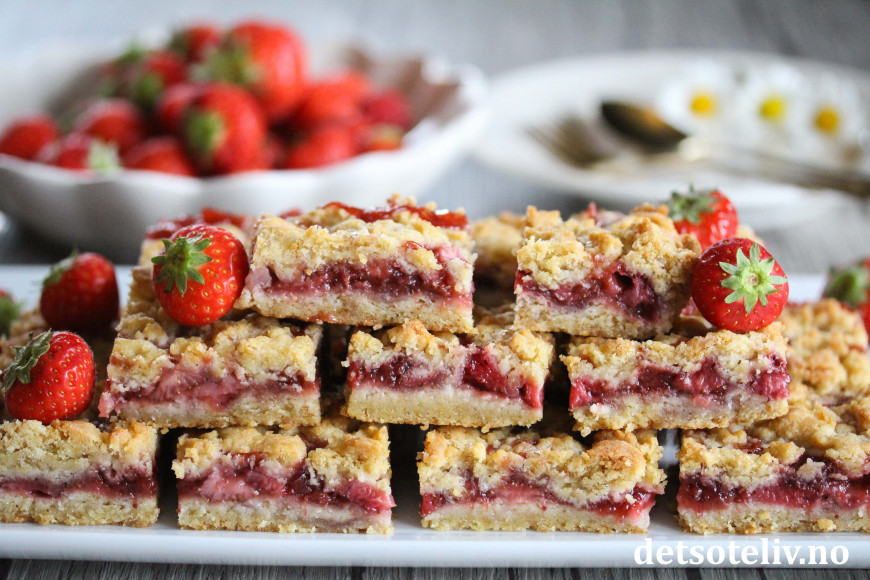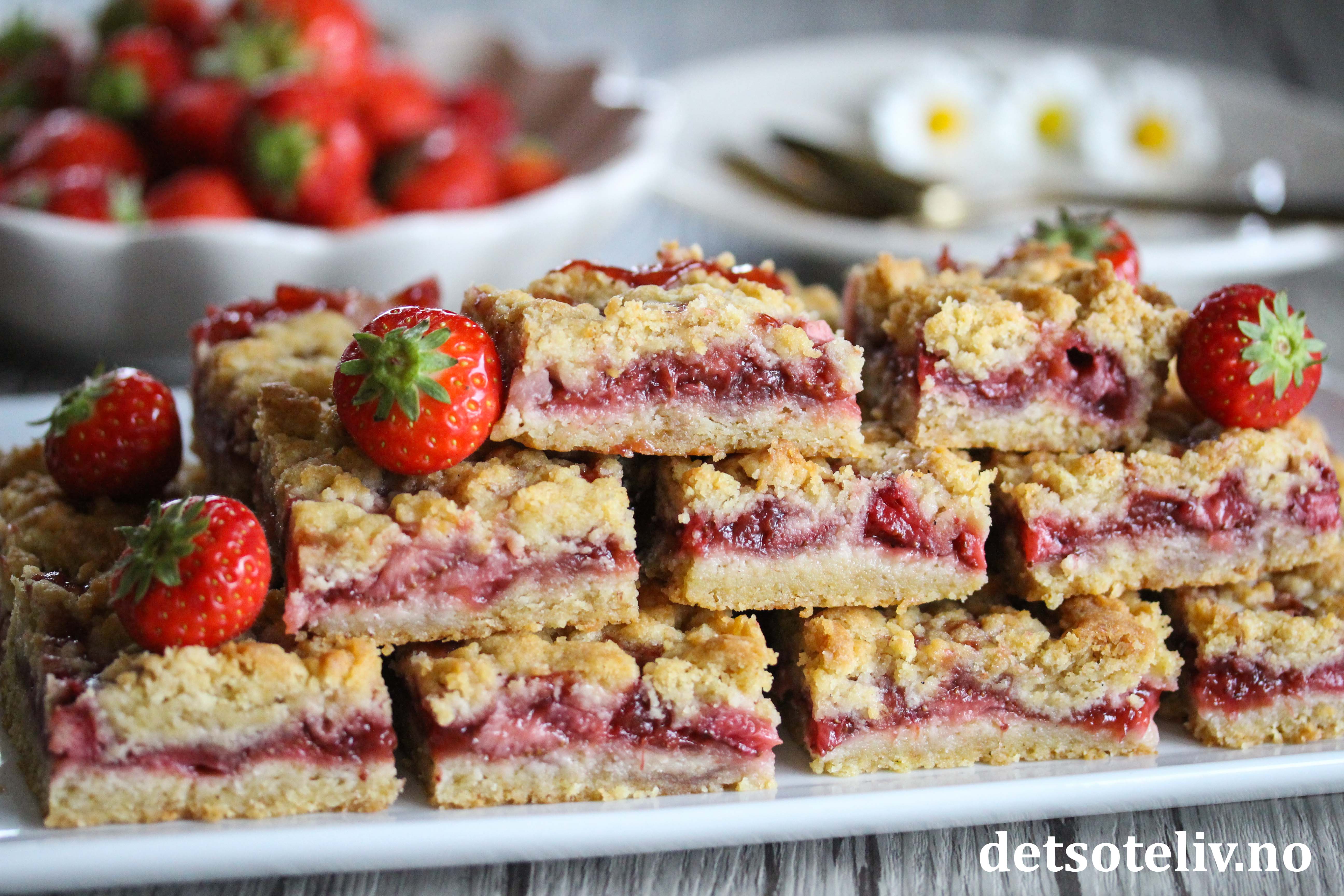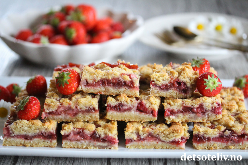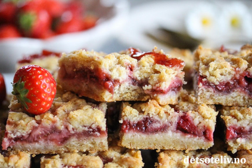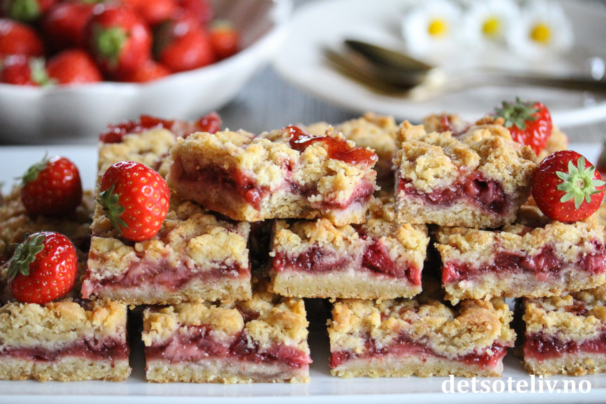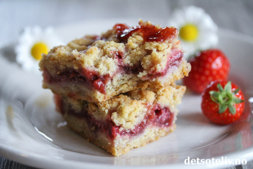 Dette er en jordbærvariant av amerikanske «Blueberry Bars». Kakene lages med mørdeig i bunnen, og det er også mørdeig som smuldres på toppen. I midten er det en kombinasjon av friske jordbær og jordbærsyltetøy.