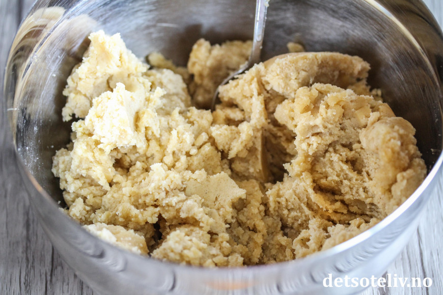 Ha mel, hvitt sukker, brunt sukker og bakepulver i en food processor. Tilsett romtemperert smør og kjør blandingen sammen slik at smøret smuldrer seg fint i det tørre. (Har du ikke en food processor, kan du smuldre smøret i det tørre med fingrene.) Visp egget lett sammen med vaniljeekstrakt og tilsett. Kna mørdeigen raskt sammen.