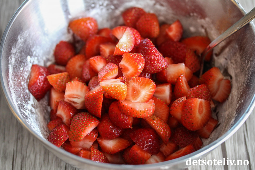 Ha dette deretter i bollen med jordbærene og bland godt slik at jordbærene blir jevnt dekket.