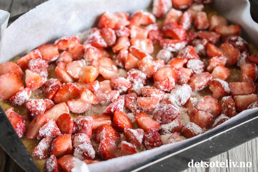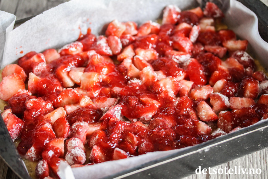 ♥ Det er lurt å la den ferdigstekte kaken stå i kjøleskapet en god stund før du skjærer den i firkanter. Da blir jordbærfyllet fastere og renner ikke når du deler kaken. Dette gjelder særlig dersom du har jordbærsyltetøy i fyllet.