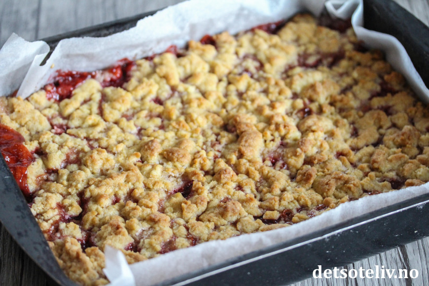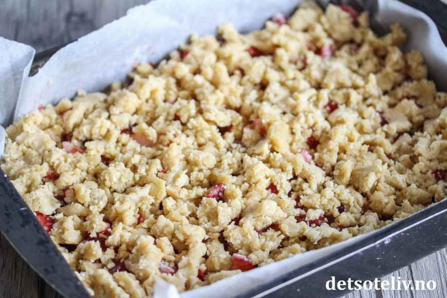 Hell bærblandingen i langpannen og fordel den jevnt utover. Legg eventuelt små klatter med jordbærsyltetøy i sprekkene mellom bærene. Smuldre resten av mørdeigen over bærene.