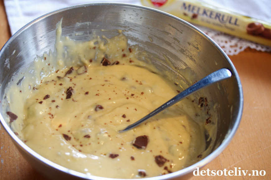 Hakk melkesjokoladen og vend sjokoladebitene inn i deigen til slutt.
