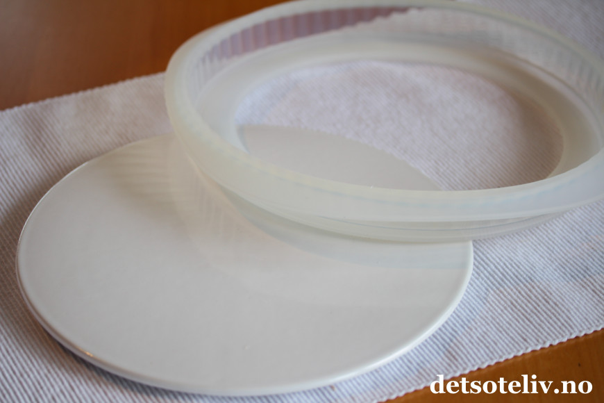 1) For det første har jeg kommet over en helt genial paiform blant alle bakeformene som du finner i nettbutikken til Bakeren og Kokken. Denne paiformen har avtagbar plastkant og fin, hvit keramikkbunn som fungerer utmerket som kakefat. Dette gjør at du bare kan fjerne kanten på formen når paien er ferdigstekt og servere kaken direkte fra bunnen - med andre ord du slipper å flytte på den ferdigstekte paien.