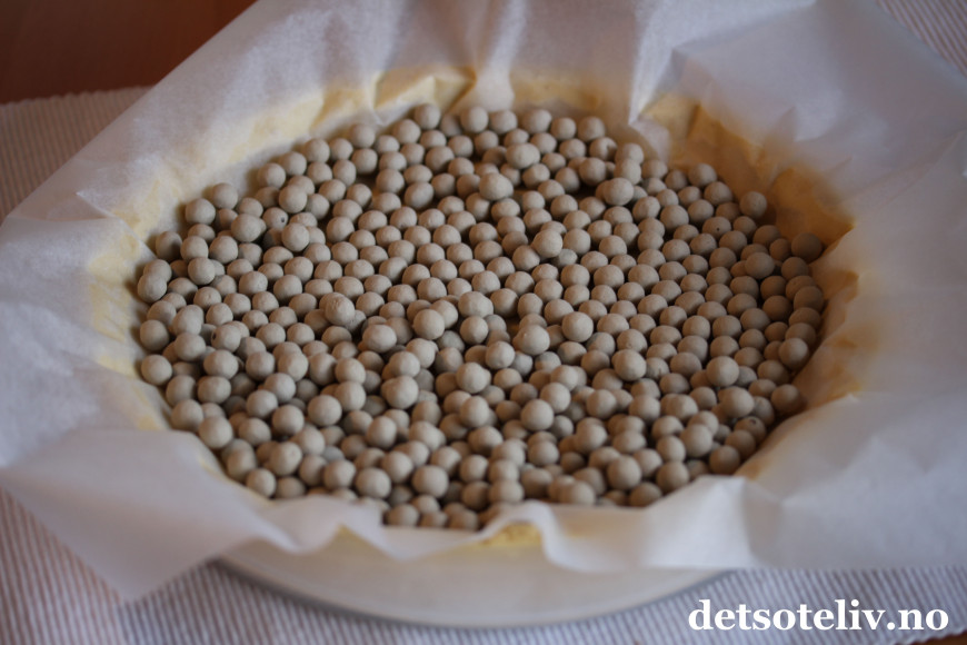 Legg et stykke bakepapir over deigen og fyll opp paiformen med keramiske bakekuler.