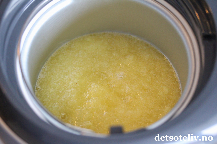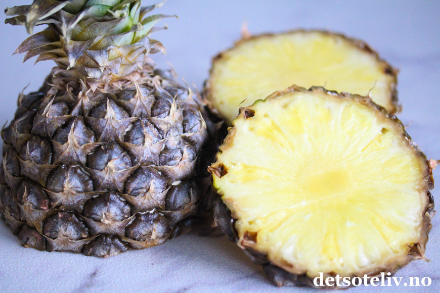 ♥ I oppskriften står det at du skal bruke ananasmos. Dette lager du ved å mose ananas med en stavmikser. Bruk helst fersk ananas for best smak, men godt avrent hermetisk ananas kan også brukes.