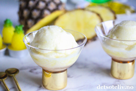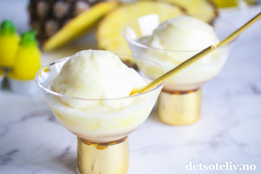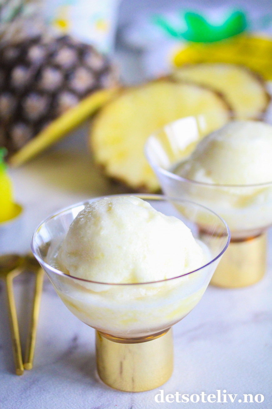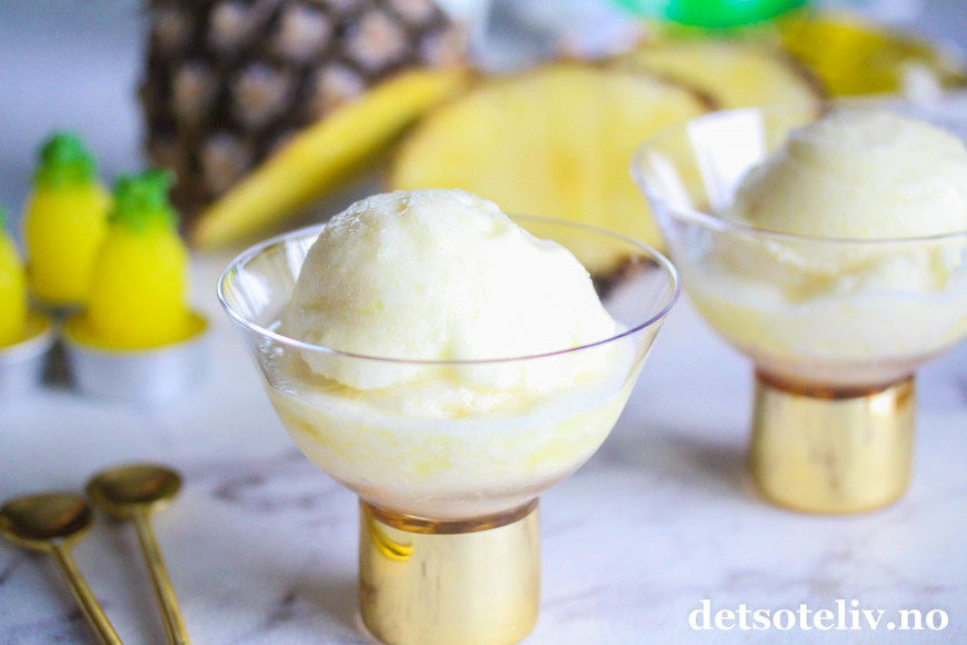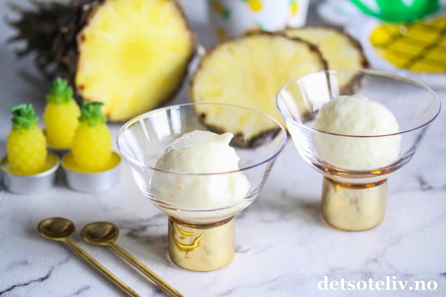 Ananassorbet smaker utrolig deilig i sommervarmen! Kan lages både med og uten iskremmaskin.