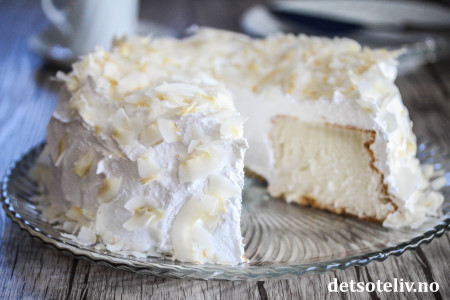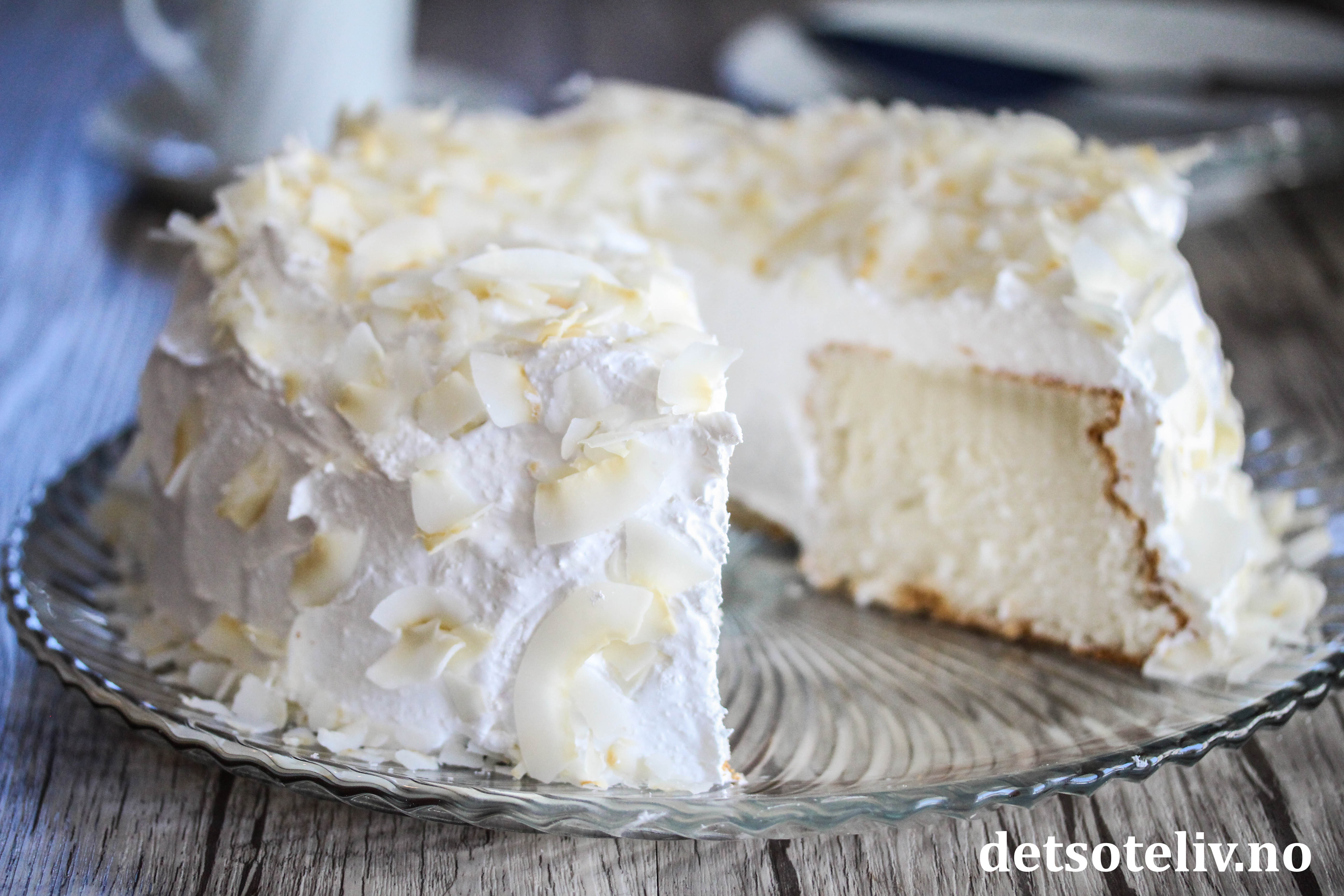 Dette er en amerikansk klassiker! "Angel Food Cake" lages med mange eggehviter og blir hvit i fargen og vidunderlig myk i konsistensen.