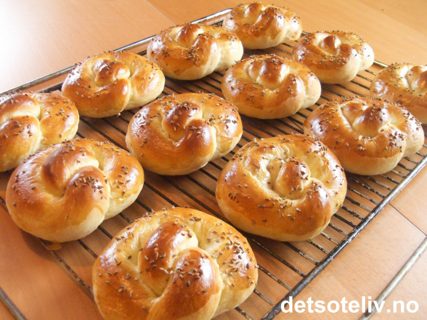 Smuldre gjæren i en bakebolle. Smelt smøret i en kjele. Ha i melken og varm opp til blandingen er fingervarm (37°C). Løs opp gjæren i væsken. Bland i sukker og anisfrø. Ha deretter i hvetemel og elt deigen sammen. Hev deigen i 45 min.