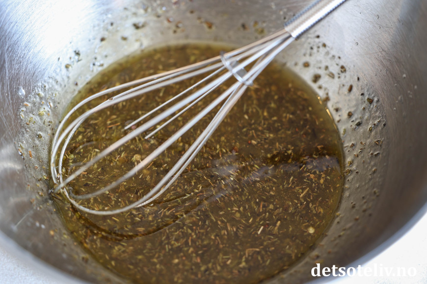 Start gjerne med å blande sammen ingrediensene til den italienske dressingen.