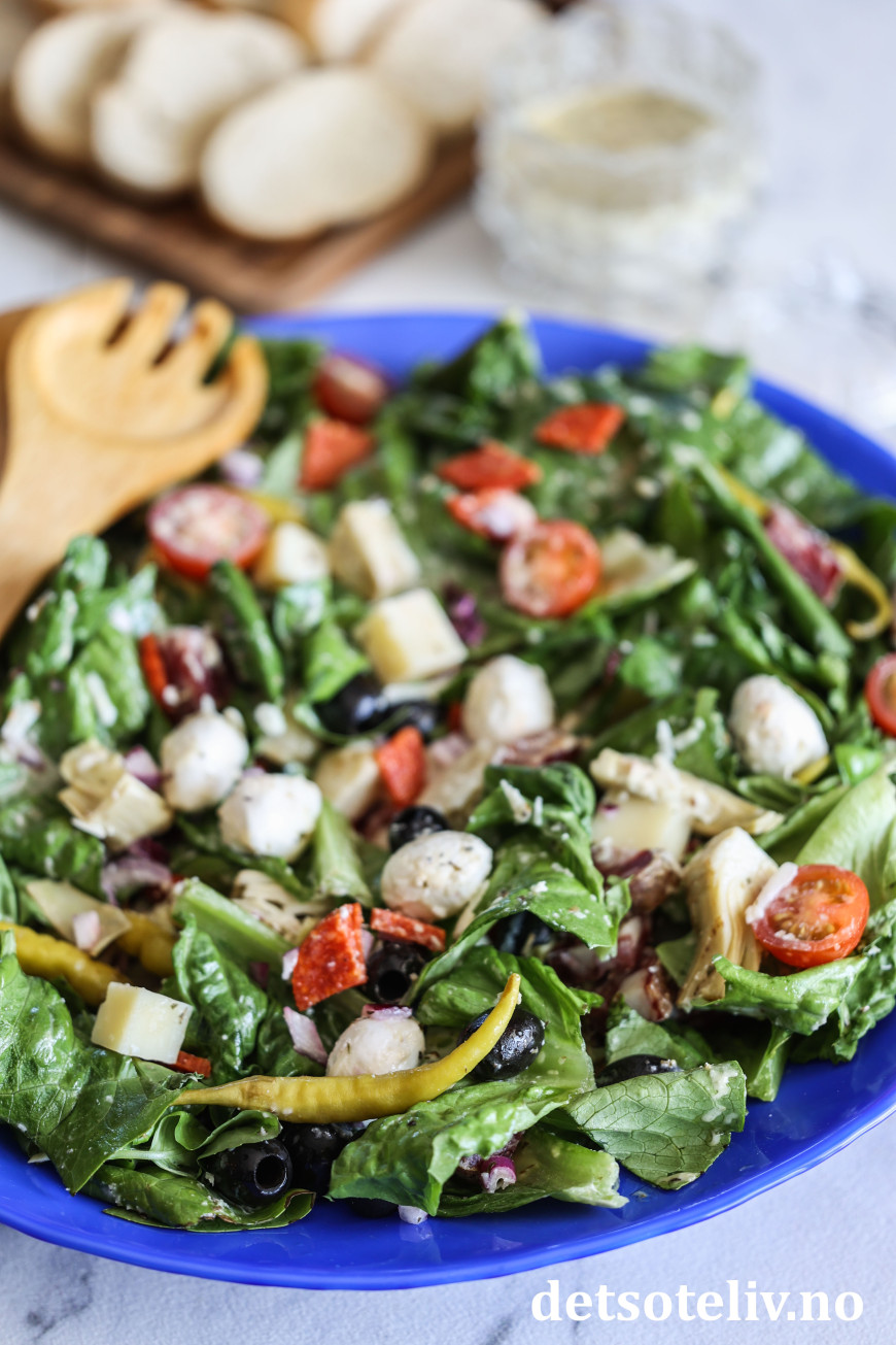 I denne salaten blandes italiensk salami og eventuelt spekeskinke, digge italienske oster, oliven, artisjokker, tomater og rødløk + + sammen med en nydelig kremet, italiensk dressing til en herlig salat med masse smak.