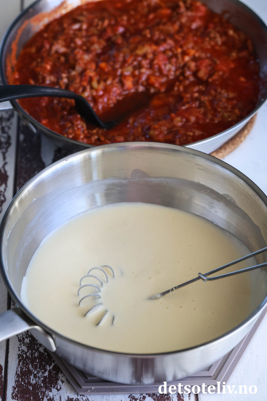 Pass i mellomtiden på at du holder både kjøttsausen og ostesausen varm.