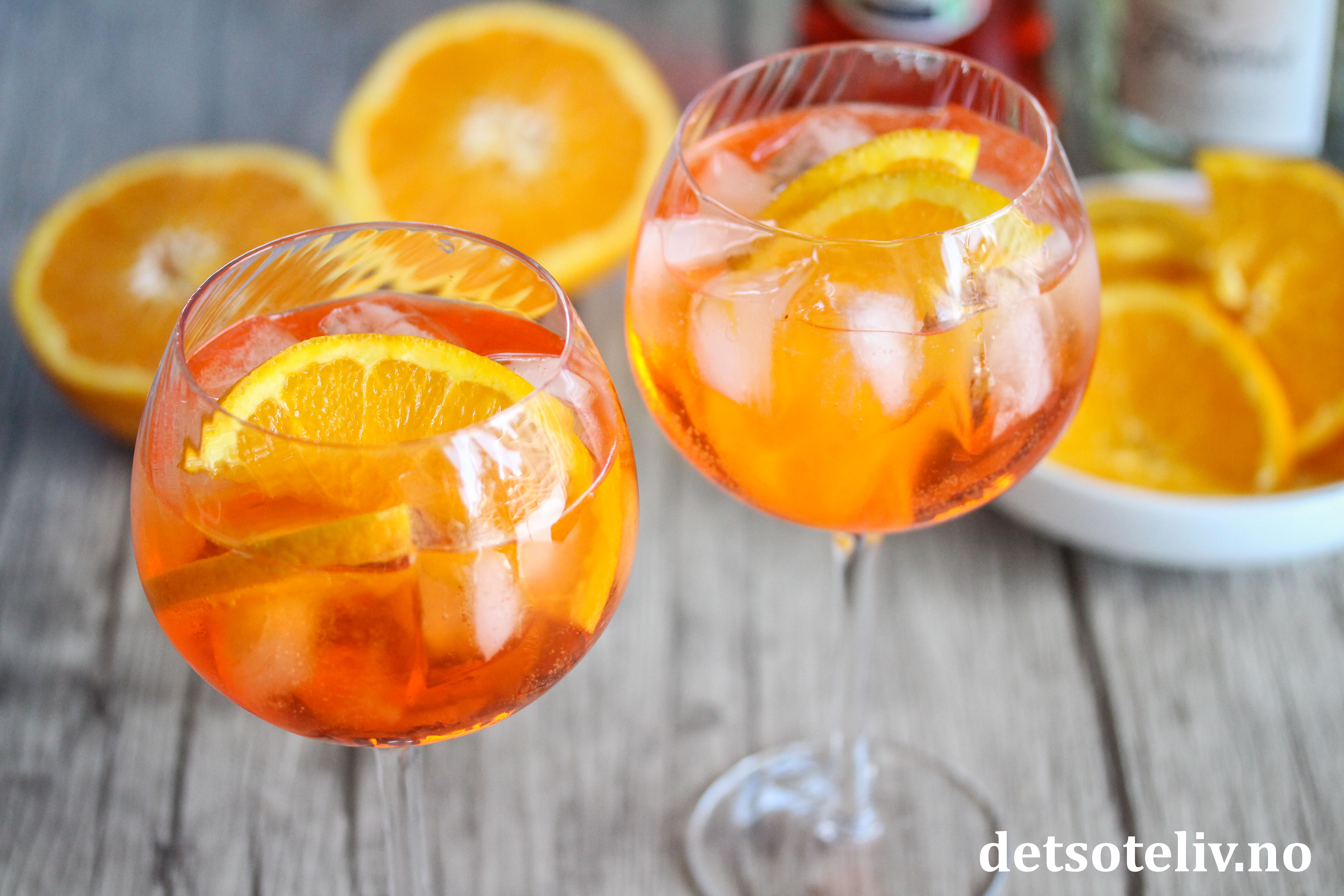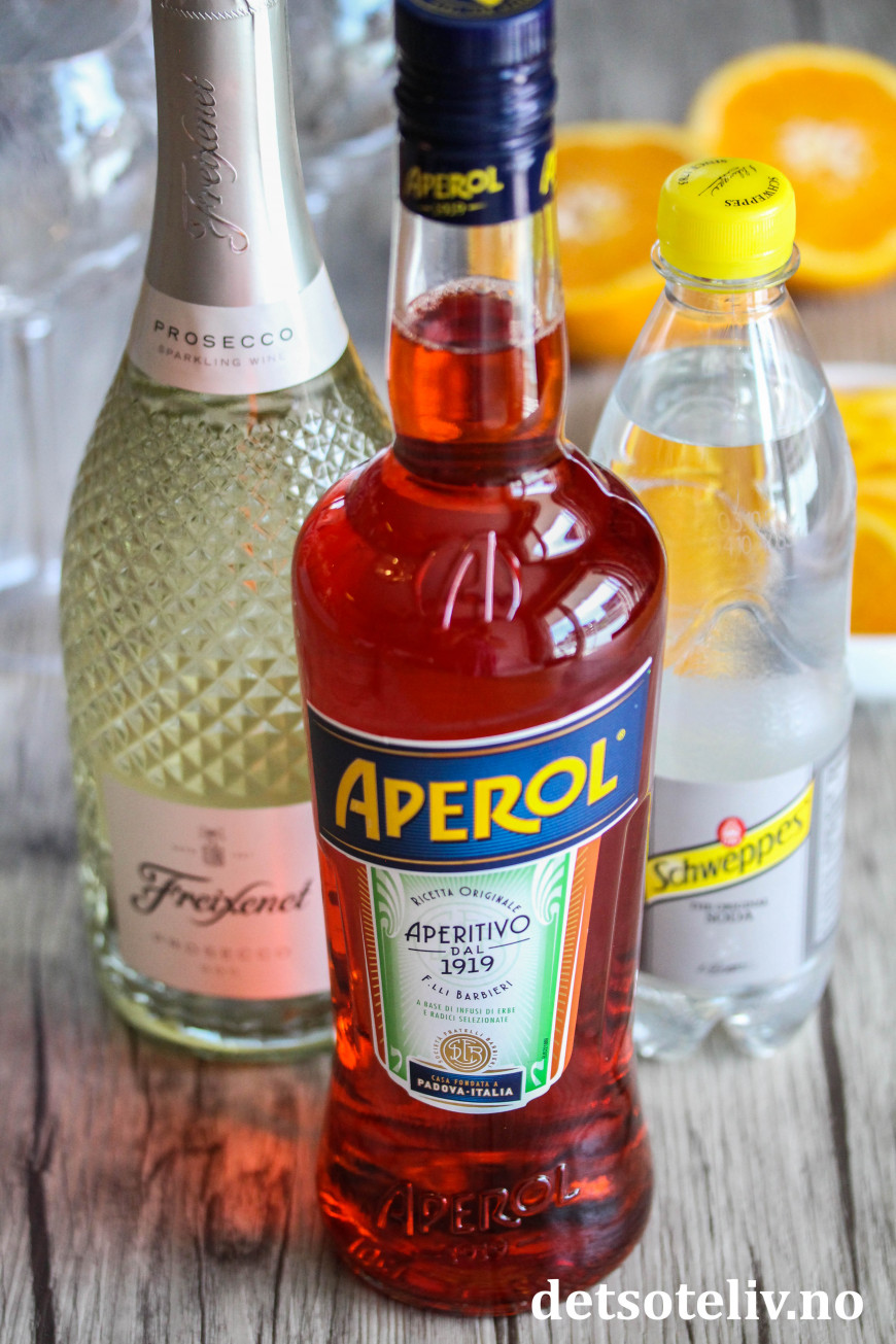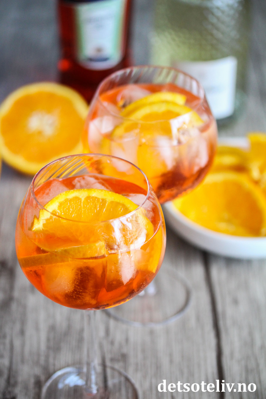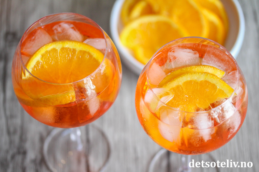 ♥ Aperol er en italiensk aperitif som er dyp oransje i fargen og har lett, bitter smak av rabarbra, appelsin og krydder. Bitterheten mildnes betydelig med masse appelsinskiver i drinken. Aperol kjøpes på polet.