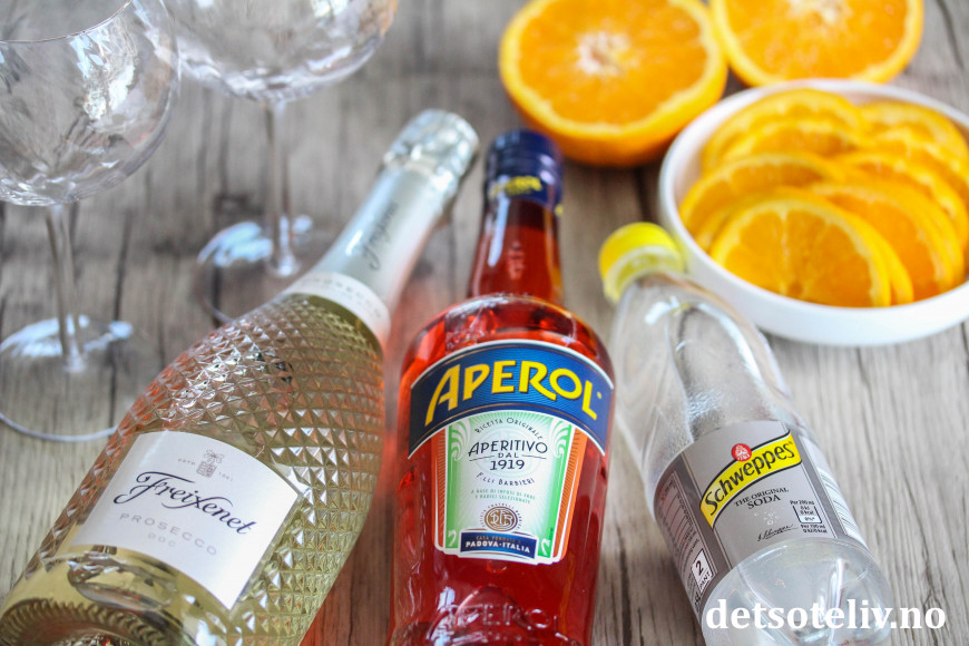 Det klassiske blandingsforholdet er 3 deler prosecco, 2 deler Aperol og 1 del sodavann, men dette tilpasser du såklart etter smak.