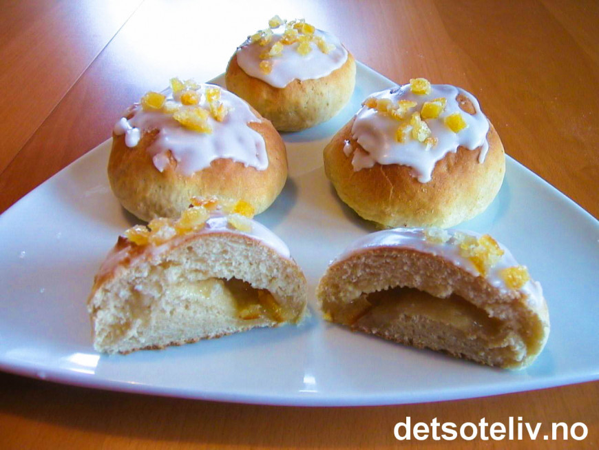 Rør sammen melis og appelsinjuice (uten fruktkjøtt). Pynt bollene med melisglasur og litt apsikat før servering.