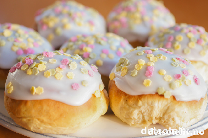 Smør melisglasuren på de avkjølte bollene og pynt med kakestrøssel.