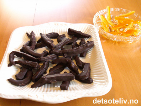 Dypp appelsinskallstrimlene en og en i den smeltede sjokoladen med en gaffel. Legg de så på bakepapiret. Sett brettet i kjøleskapet til sjokoladen har stivnet.