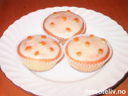 Rør sammen melis og appelsinsaft til melisglasur. Pynt de kalde muffinsene med litt glasur og noen biter med apsikat.