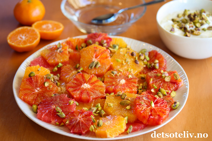 Jeg har brukt en miks av vanlige, gule appelsiner, røde appelsiner (såkalte "blodappelsiner") og mandariner. I tillegg blandet jeg inn skiver av en rød grapefrukt, som jeg synes gir en herlig, syrlig kontrast - og syrligheten blir uansett kompensert med den søte honninglaken som helles over frukten. I tillegg drysser jeg over litt kanel og hakkede pistasjnøtter.
